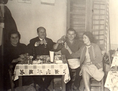 Το 1945 ήρθα στον Αλμυρό και για τρία χρόνια, μέχρι το 1947, δούλεψα κοντά στον Κώστα Καλατζή που είχε παντοπωλείο, εκεί όπου αργότερα πήραμε το πρώτο μας μαγαζί. Εκείνη τη χρονιά κατέβηκαν από τους Κοκκωτούς στον Αλμυρό και τα υπόλοιπα μέλη της οικογένειας, ανταρτόπληκτοι. Ο αδερφός μου πήγε να δουλέψει στο Βόλο κι εμείς ανοίξαμε μια ταβέρνα στην οδό Ερμού, απέναντι από το οικόπεδο του Τέντα, μαζί με τον Θανάση Κιάκο. Εκεί πουλούσαμε τσίπουρο με μεζέ αλλά και ψητό, γιατί ο Κιάκος είχε γίδια που λόγω των ανταρτών δεν είχε που να τα πάει, κι έτσι αναγκαζόταν να τα σφάζει και να τα προσφέρουμε δωρεάν για μεζέ μαζί με το τσίπουρο. Επειδή, όμως, το μαγαζί ήταν και ταβέρνα, φτιάχναμε και κοκορέτσι και προσφέραμε επίσης κρασί και πατσά. Ο πατέρας μου μαγείρευε κι εμείς οι υπόλοιποι βοηθούσαμε.