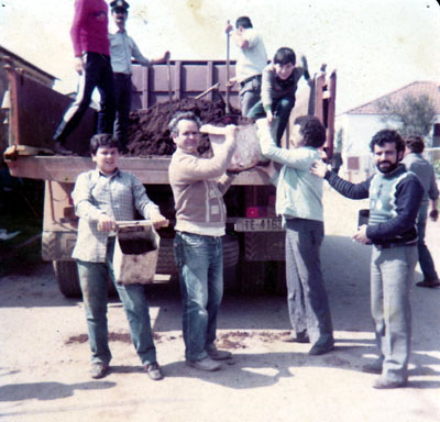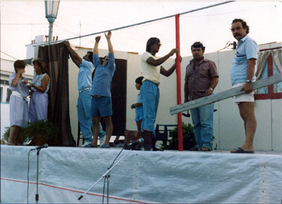 1986. Προετοιμασία των σκηνικών για την παρουσίαση της θεατρικής παράστασης “Ο Κουτρουβαρέας”, στις πολιτιστικές εκδηλώσεις του Αλμυρού