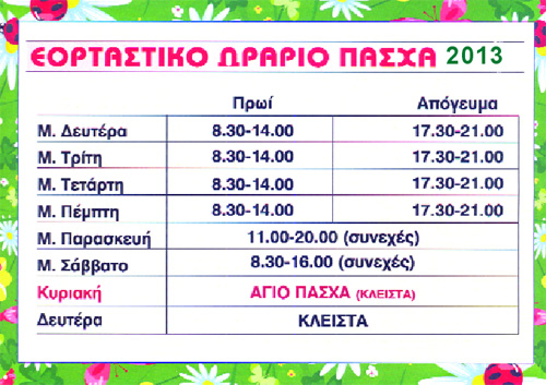 ΔΕΛΤΙΑ ΤΥΠΟΥ 15 Απριλίου, 2013 Το εορταστικό ωράριο καταστημάτων του Πάσχα Μετά από Δελτίο Τύπου της Ένωσης Επαγγελματοβιοτεχνών, δημοσιεύουμε το φετινό εορταστικό ωράριο των καταστημάτων για το Πάσχα.
