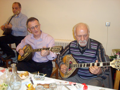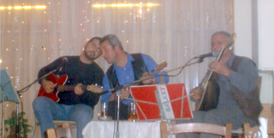 Στην πρώτη κοπή πίτας του “Συλλόγου Φίλων Μουσικής Αλμυρού”, στην ταβέρνα “Ούτας”, το Φεβρουάριο του 2013, με τον Παναγιώτη Μαυρογέννη και τον Δημήτρη Κατσαούνη