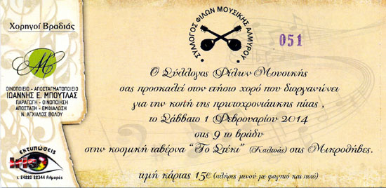 Ο Σύλλογος Φίλων Μουσικής Αλμυρού προσκαλεί όλους τους φίλους του και τους φίλους της μουσικής στην εκδήλωση για την κοπή της Πρωτοχρονιάτικης πίτας, που θα γίνει το Σάββατο 1η Φεβρουαρίου 2014, στις 9 το βράδυ, στο κέντρο «Το Στέκι» (Καλτσάς) στις Μικροθήβες.