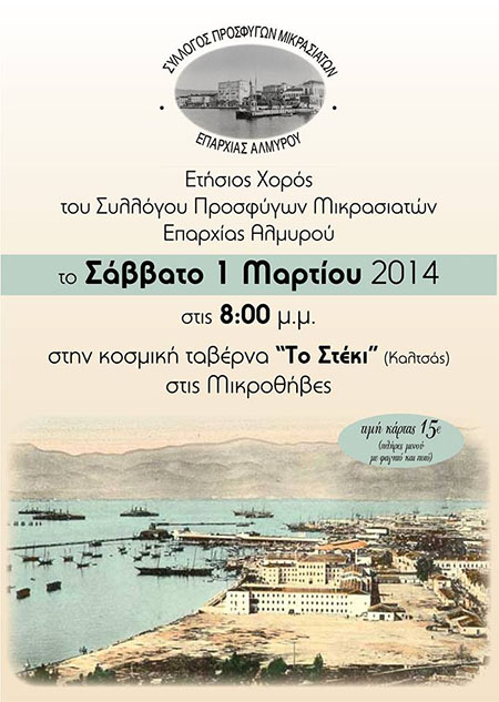 Ο Σύλλογος Προσφύγων Μικρασιατών Επαρχίας Αλμυρού σας προσκαλεί στον Ετήσιο Χορό του Συλλόγου, το Σάββατο 1η Μαρτίου 2014, στις 8 μ.μ., στην κοσμική ταβέρνα «Το Στέκι» (Καλτσάς) στις Μικροθήβες.