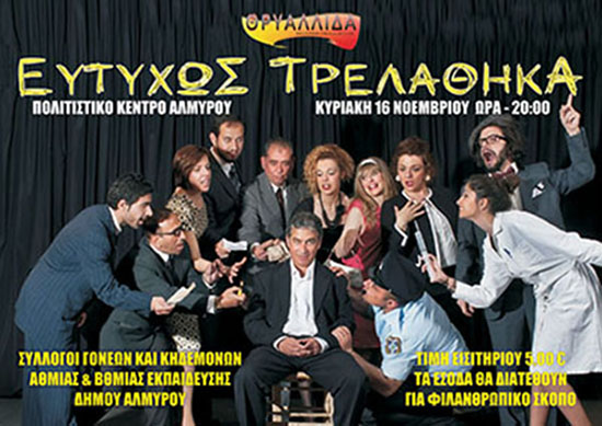 Οι Σύλλογοι Γονέων και Κηδεμόνων Πρωτοβάθμιας και Δευτεροβάθμιας Εκπαίδευσης του Δήμου Αλμυρού, σε συνεργασία με τη Θεατρική Ομάδα “ΘΡΥΑΛΛΙΔΑ” του Βόλου, διοργανώνουν εκδήλωση για την παρουσίαση της θεατρικής παράστασης με τίτλο “Ευτυχώς τρελάθηκα”, την Κυριακή 16 Νοεμβρίου 2014, στην αίθουσα εκδηλώσεων του Πολιτιστικού Κέντρου Αλμυρού.