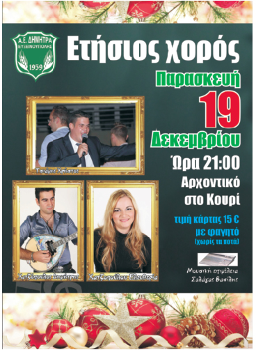 ΑΘΛΗΤΙΣΜΟΣ 16 Δεκεμβρίου, 2014 Την Παρασκευή ο ετήσιος χορός της Α.Ε. Δήμητρας Ευξεινούπολης Την ερχόμενη Παρασκευή 19 Δεκεμβρίου, οι φίλοι της Α.Ε. Δήμητρας Ευεξινουπόλεως διασκεδάζουν στο ολοστόλιστο “Αρχοντικό” στο Δάσος Κουρί.