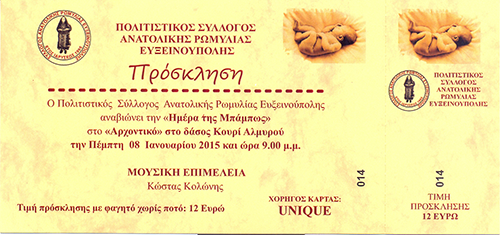 Λάβαμε και δημοσιεύουμε πρόσκληση από τον πολιτιστικό Σύλλογο Ανατολικής Ρωμυλίας Ευξεινούπολης για την ημέρα της Μπάμπως που θα πραγματοποιηθεί την Πέμπτη 8 Ιανουαρίου 2015 στο ‘Αρχοντικό’ Δάσος Κουρί.