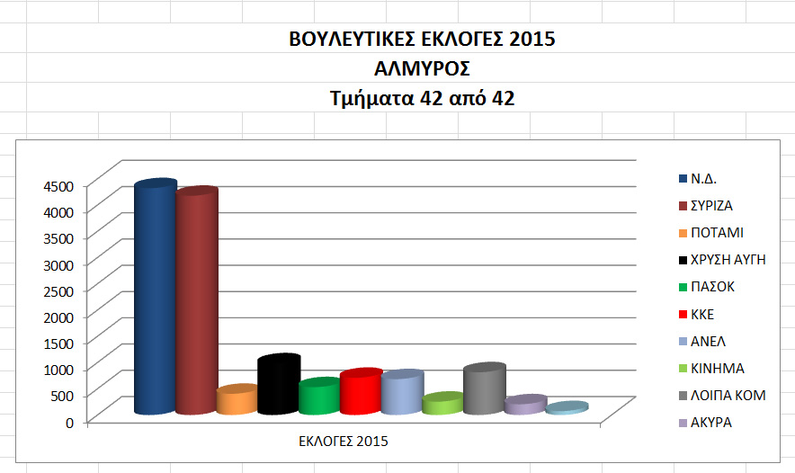 Τοπικά 26 Ιανουαρίου, 2015 Τελικά Αποτελέσματα Αλμυρού Ψήφισαν οι Αλμυριώτες σε αριθμούς: Εγγεγραμμένοι 19603 Ψήφισαν 13163 Λευκά 75 Άκυρα 205 0 ΣΥΡΙΖΑ 4177 Ν.Δ. 4322 ΠΟΤΑΜΙ 405 ΧΡΥΣΗ ΑΥΓΗ 985 ΠΑΣΟΚ 531 ΚΚΕ 709 ΑΝΕΛ 684 ΚΙΝΗΜΑ 255 ΛΟΙΠΑ ΚΟΜΜΑΤΑ 815