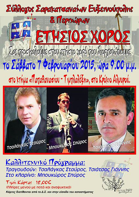 Ο Σύλλογος Σαρακατσαναίων Ευξεινούπολης και Περιχώρων προσκαλεί τα μέλη και τους φίλους του στον ετήσιο χορό που διοργανώνει το Σάββατο 7 Φεβρουαρίου 2015 και ώρα 9:00 μ.μ., στο Κτήμα “Παπαθανασίου – Τιμπλαλέξη” στο Κρόκιο Αλμυρού.