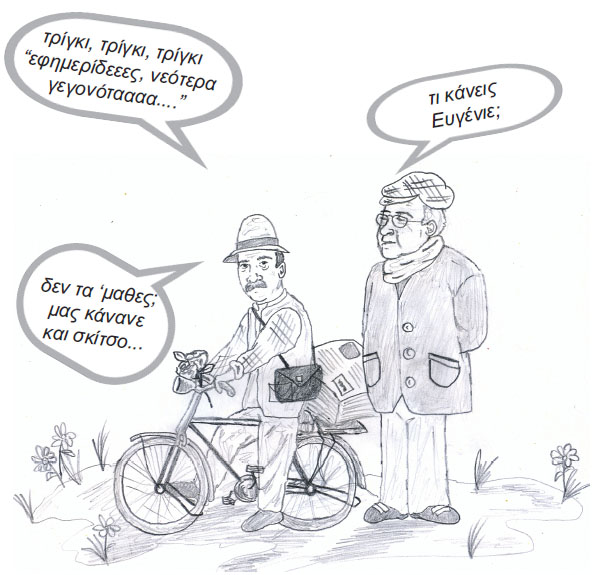 Όπως λέει και ο Γιώργος Τσιντσίνης, αν δεν ήταν ο Ευγένιος, δεν θα συνήθιζαν ίσως οι Αλμυριώτες να διαβάζουν εφημερίδες. Έτσι λοιπόν, εμείς το εξελίξαμε λιγάκι και κάναμε μια σκιτσοπαρέα του επί 14 χρόνια εκδότη του Αλμυρού, μαζί με τον από το 1954 εφημεριδοπώλη του Αλμυρού. Δεύτερη παρέα, για λίγο πιο ζουμερά σχόλια θα είναι ο Κράσος, η Κρισούλα και ο έφηβος Ελλάνης.