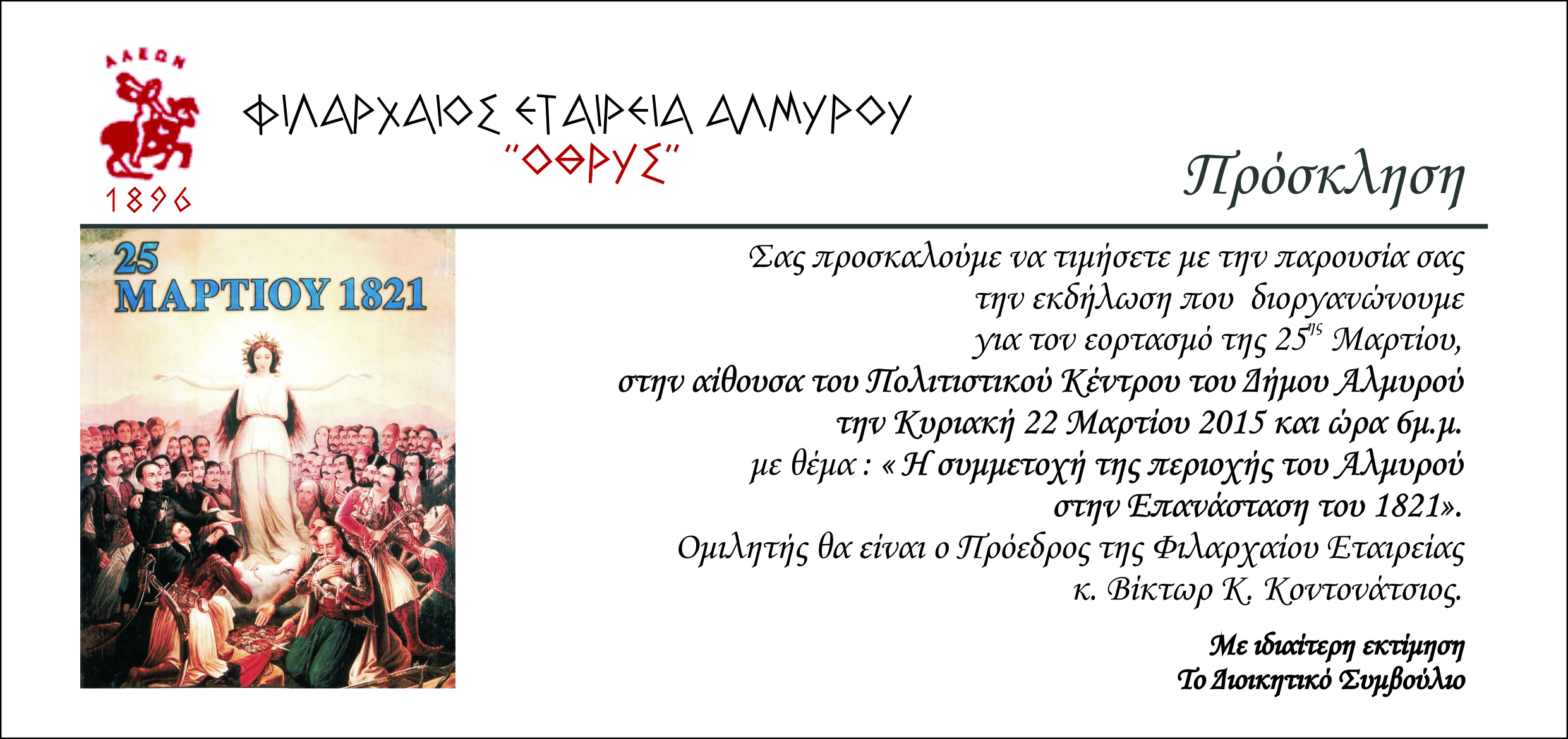 – Στις 22 Μαρτίου 2015  θα πραγματοποιηθεί ομιλία με θέμα: «Η συμμετοχή της περιοχής του Αλμυρού στον απελευθερωτικό αγώνα του 1821».
