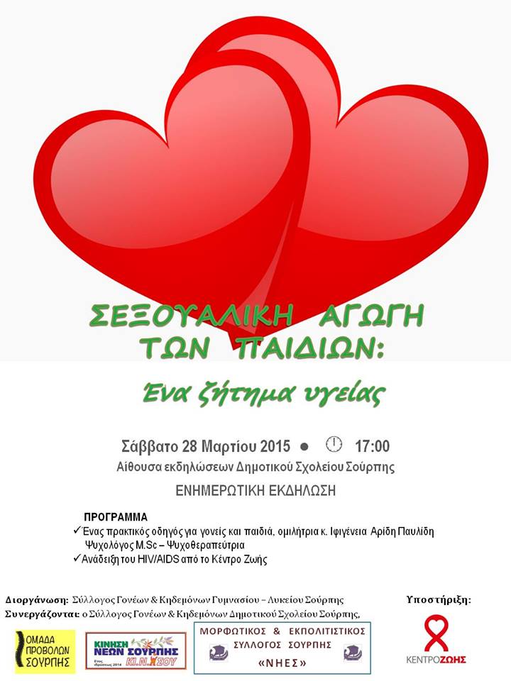 Σύσσωμοι οι φορείς της Σούρπης, όπως αναφέρονται στην αφίσα παρακάτω, διοργανώνουν εκδήλωση – ομιλία με θέμα την ενημέρωση για τη σεξουαλική αγωγή των παιδιών, το ερχόμενο Σάββατο 28 Μαρτίου, στην αίθουσα του Δημοτικού Σχολείου Σούρπης.