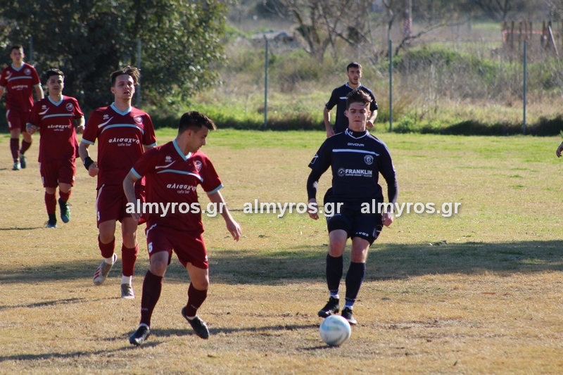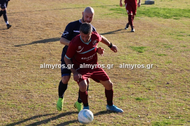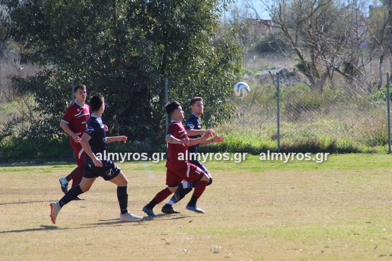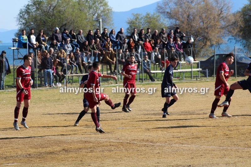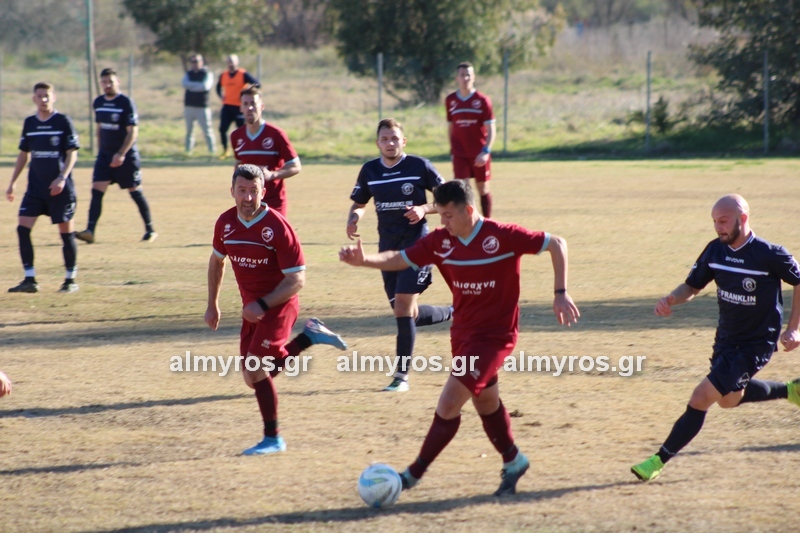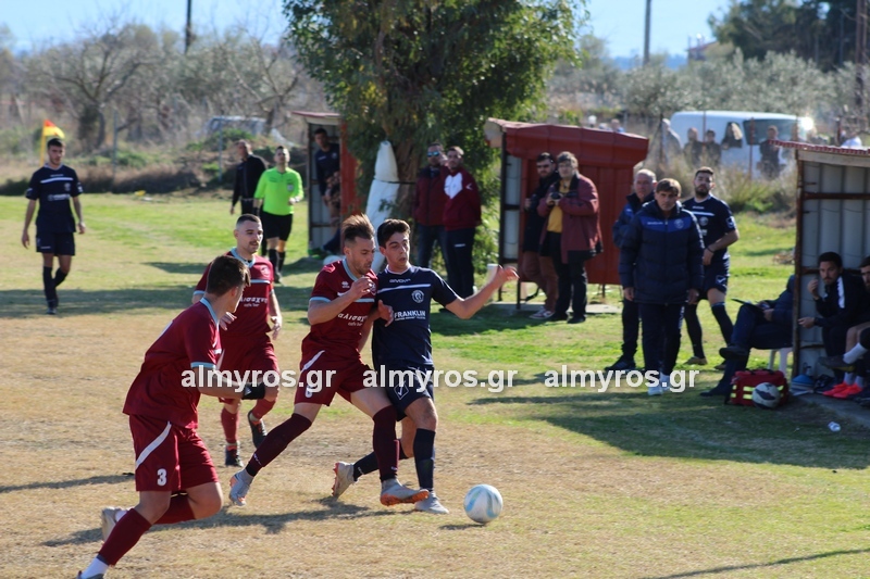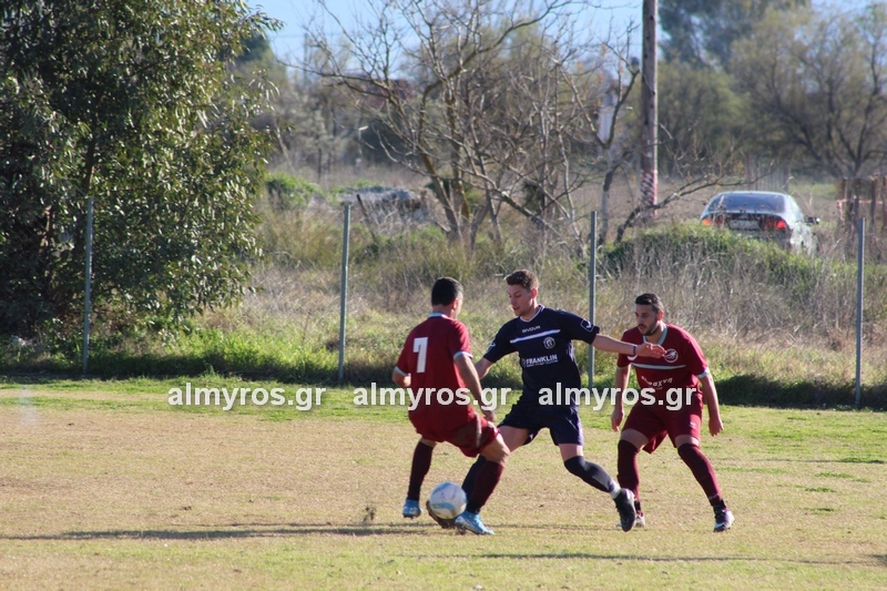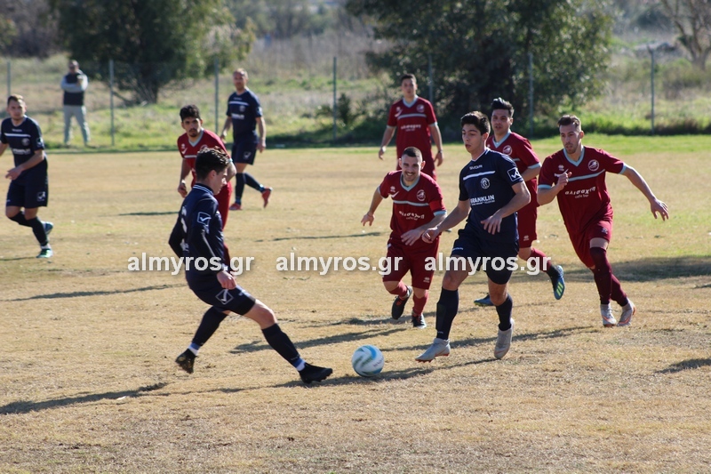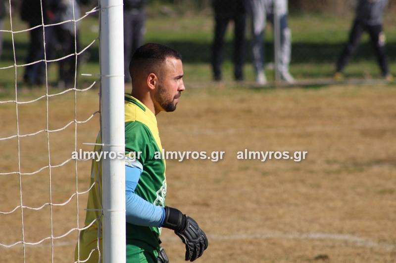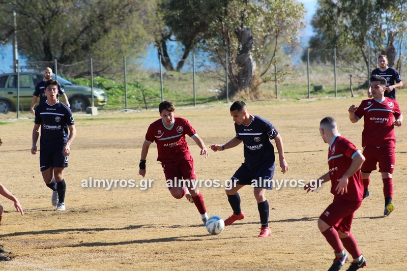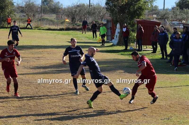 Στο 19′ πλασέ του Καραγιώργου από πολύ πλάγια θέση πέρασε παράλληλα με την εστία, στο 26′ διαγώνιο σουτ του ίδιου παίκτη απέκρουσε στην κλειστή γωνία ο Καλαϊτζίδης, στο 33′ ο γκολκίπερ του Ρήγα Φεραίου εξουδετέρωσε νέα προσπάθεια του Καραγιώργου και στο 34′ χάθηκε μεγάλη ευκαιρία όταν σουτ του Απριγιάν δεν ήταν καλό αλλά βγήκε πάσα για τον Νούσια που από κοντά αστόχησε. Η ομάδα του Βελεστίνου στο α’ μέρος είχε μόνο δύο σουτ εκτός μεγάλης περιοχής του Σουγκάρη που δεν ανησύχησαν τον Μουράβα.