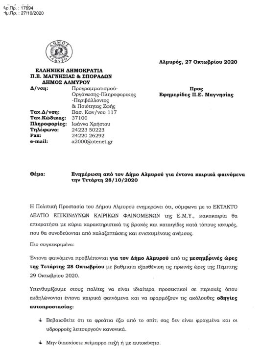 Uncategorized 27 Οκτωβρίου, 2020 Ο Δήμος Αλμυρού ενημερώνει για έντονα καιρικά φαινόμενα Δημοσιεύουμε ανακοίνωση της πολιτικής προστασίας του Δήμου Αλμυρού, σχετικά με έντονα καιρικά φαινόμενα που περιμένουμε από την Τετάρτη το απόγευμα και έως την Πέμπτη το πρωί. Ακολουθεί αυτούσιο: Tags έντονα καιρικά φαινόμενα αλμυρός κακοκαιρία αλμυρός
