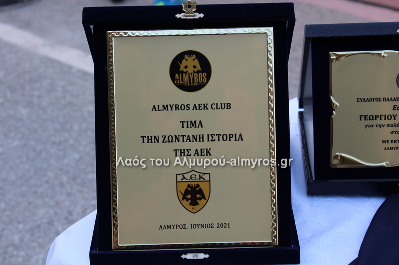 Την τιμητική πλακέτα στους παλαιμάχους της ΑΕΚ που δέχθηκαν και ήρθαν στον Αλμυρό για τον φιλικό αυτό αγώνα (σε μια δύσκολη εποχή λόγω κορωνοϊού και τριημέρου) παρέδωσε στον Λάμπρο Γεωργιάδη ο σπουδαίος άσος του αλμυριώτικου ποδοσφαίρου Βασίλης Βασιλάκος, ενώ ο πρόεδρος του συνδέσμου φιλάθλων ΑΕΚ στον Αλμυρό Almyros AEK Club, Κώστας Καναβός βράβευσε τον Στέλιο Σεραφίδη.