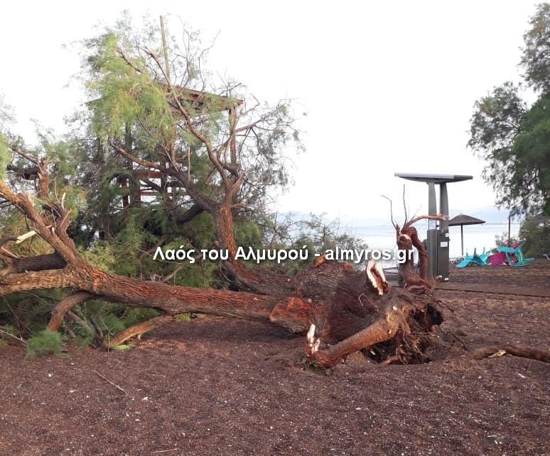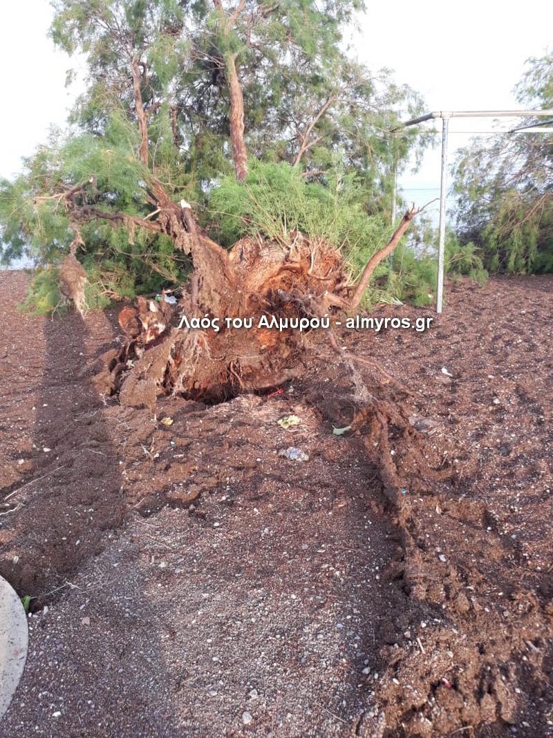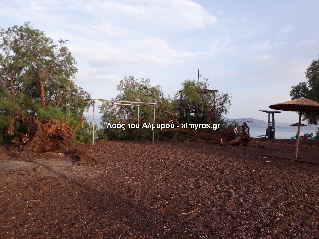 Ο δυνατός αέρας σήμερα το απόγευμα, Πέμπτη 26/8, είχε ως αποτέλεσμα καταστροφές στην παραλία της Νέας Αγχιάλου. Όταν ξέσπασε το ξαφνικό μπουρίνι που είχε σφοδρό αέρα αλλά όχι και δυνατή βροχή, οι επιχειρηματίες έτρεχαν να μαζέψουν τις ξαπλώστρες ,τις καρέκλες και τα τραπέζια από την άμμο, ομπρέλες χάλασαν, ενώ όπως μπορείτε να δείτε στις χαρακτηριστικές φωτογραφίες που τραβήξαμε πριν λίγα λεπτά, μεγάλα δένδρα -αλμυρίκια- ξεριζώθηκαν και έσπασαν στην περιοχή του ναυαγοσώστη. Επίσης, στην περιοχή πάνω από το νεκροταφείο, ξηλώθηκε από τη μανία του δυνατού αέρα μία στέγη από οίκημα.