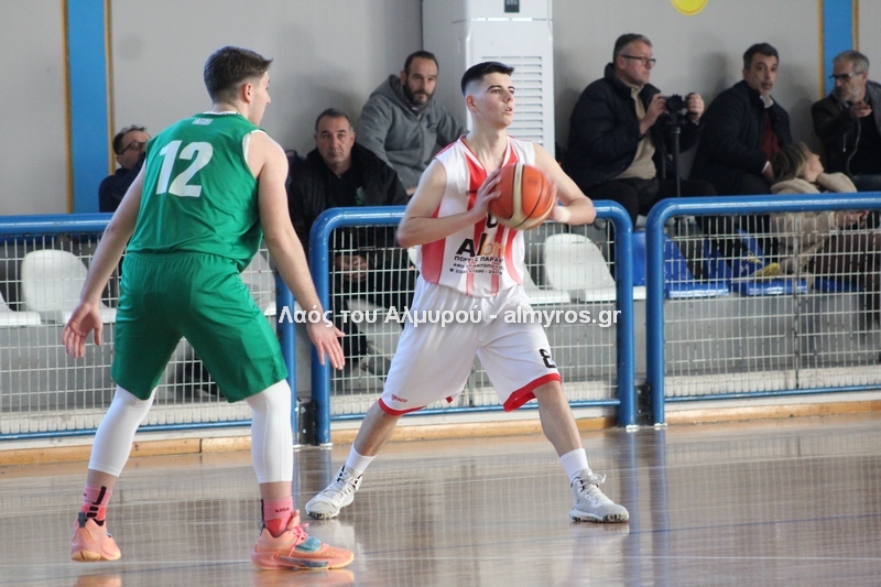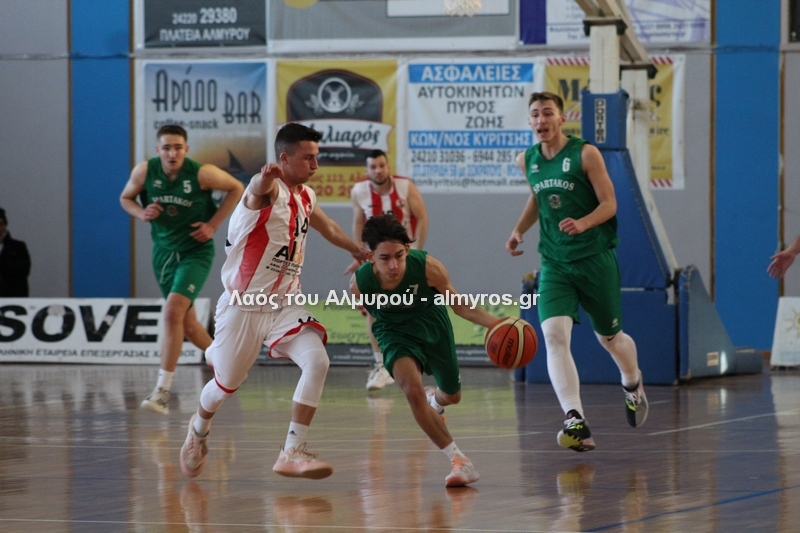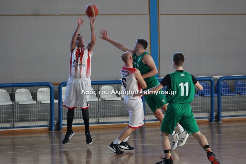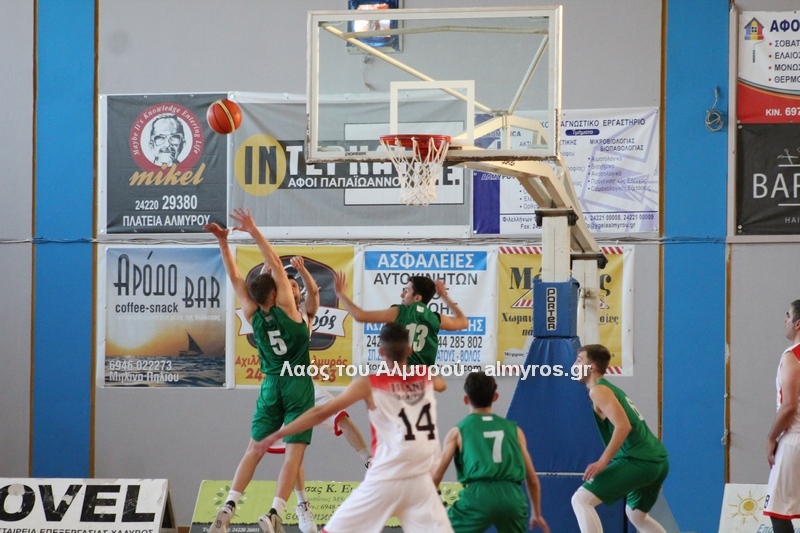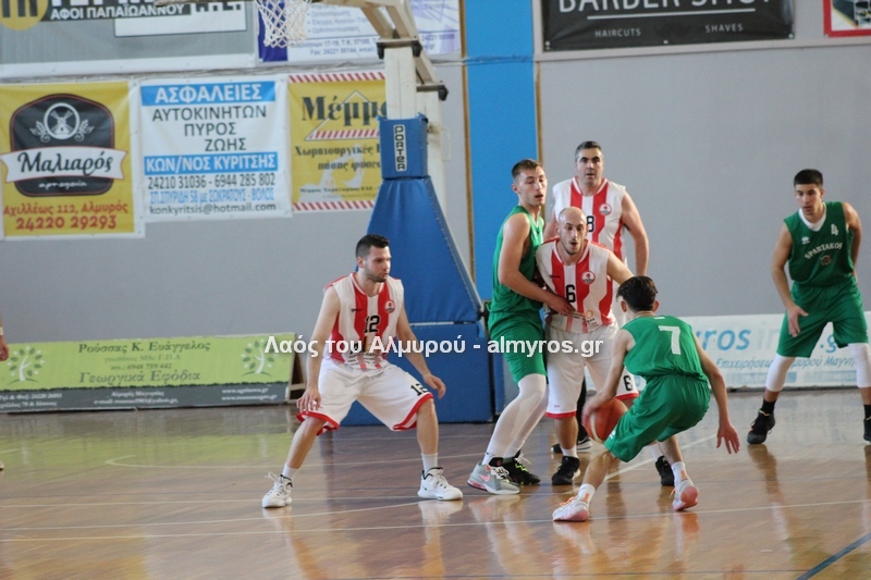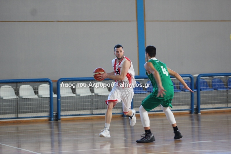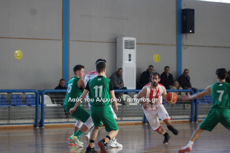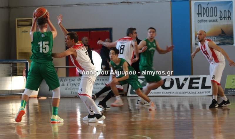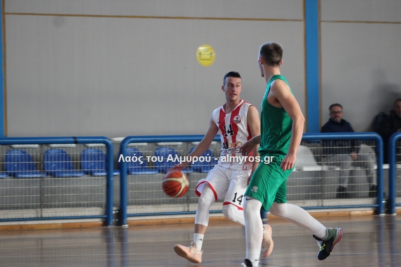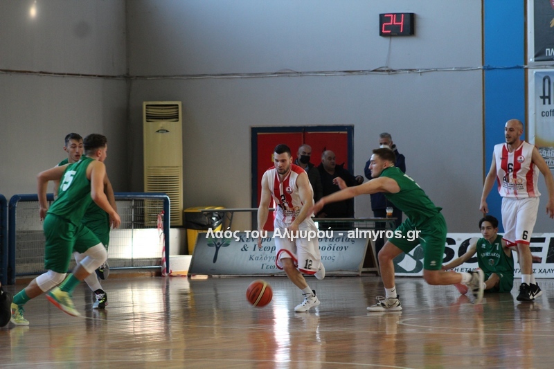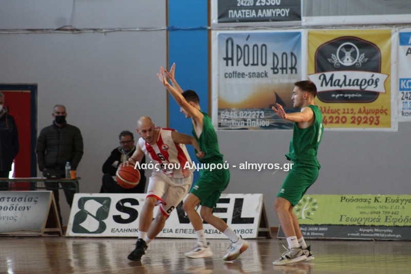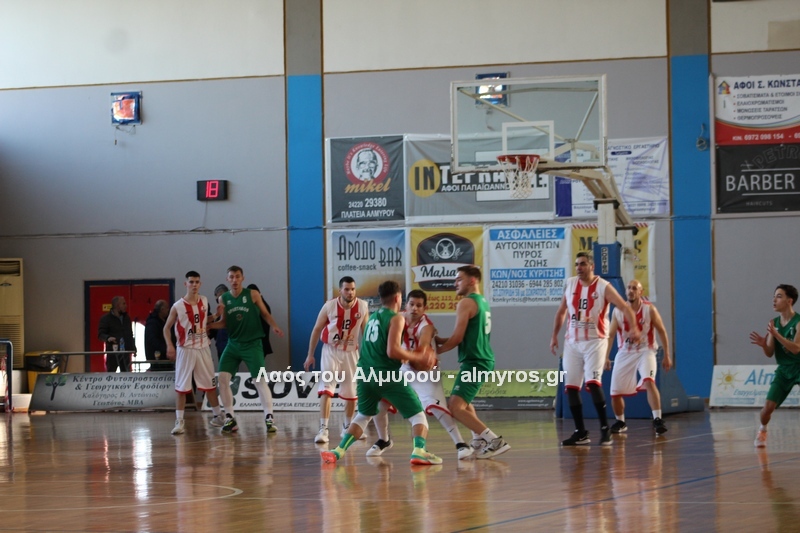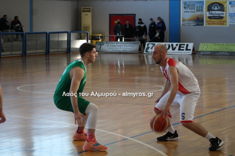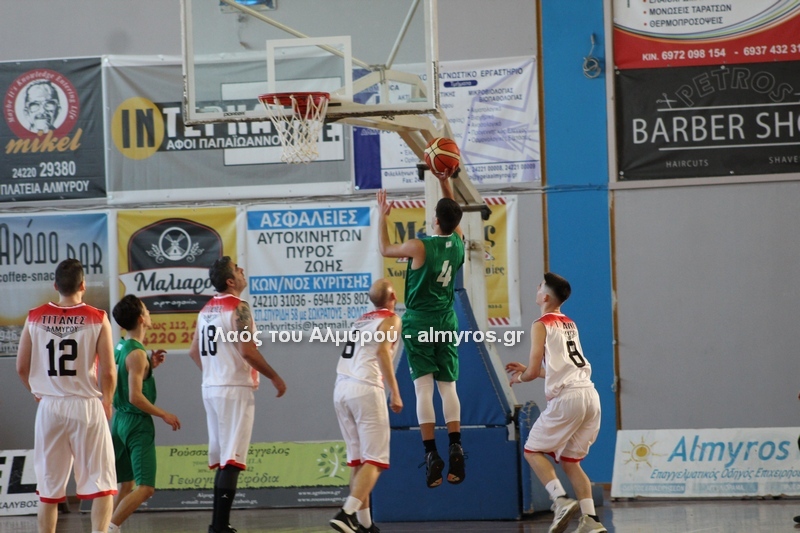 Γρήγορο 0-5 σε 49 δευτερόλεπτα έφερε την αντίδραση του Αλμυριώτη προπονητή ο οποίος ζήτησε τάιμ άουτ για να δώσει οδηγίες στους παίκτες του. Αμέσως μετά ο Μητρουλάς με τρίποντη βόμβα έδωσε εκ νέου αέρα δέκα πόντων στους Τιτάνες και ο ψηλός πέτυχε και το επόμενο καλάθι, αυτή τη φορά από κοντά για το 28-17 (είχε τους 5 πόντους των Τιτάνων στα πρώτα 6 λεπτά της περιόδου). Οι Λαρισαίοι αντέδρασαν ψαλιδίζοντας τη διαφορά στους τρείς. Πέτυχαν 14 πόντους σε 6:30 πριν ο Παπαβαΐτσης με μία βολή σπάσει το σερί τους. Ο Δασκαλόπουλος έφερε το ματς στον πόντο, 29-28 στο 17:43, ο Πανάγος ισοφάρισε και ο Ζέρβας το 29-31. Από το 26-16 είχαμε το 29-31 (επιμέρους 3-15). Ο Συνάζος με δύο λέι απ και ο Κουρκούμπας με βολή έδωσαν λύσεις για τους «ερυθρόλευκους» και το ημίχρονο έκλεισε με σκορ 34-35.