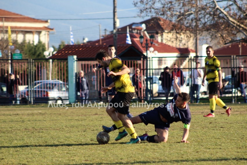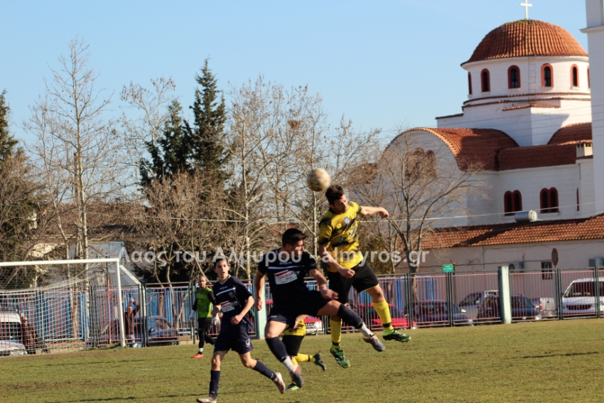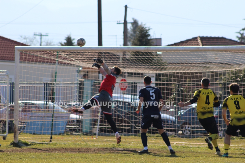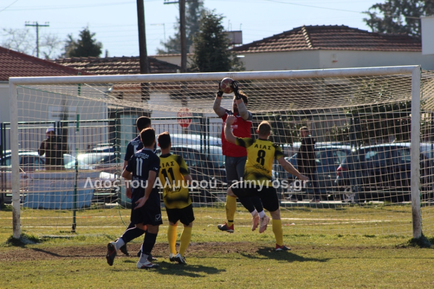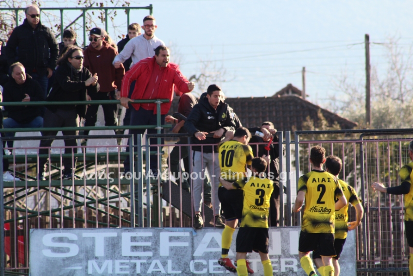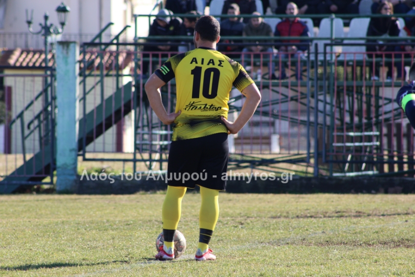 Ο Χειλάς δεν βρήκε καλά την μπάλα ενώ ήταν μόνος μπροστά στην εστία (39′) και στο τελευταίο λεπτό του πρώτου ημιχρόνου, είχαμε αποβολή και γκολ: η ομάδα του Βελεστίνου έμεινε με δέκα παίκτες όταν ο Γοδενόπουλος μάρκαρε αντικανονικά τον Βούλγαρη και δέχθηκε, σωστά, κίτρινη κάρτα, τη δεύτερη στο ματς. Από αυτό το φάουλ, ο Θανάσης Κατσαβριάς πέτυχε γκολ περνώντας την μπάλα δίπλα από το τείχος, άλλο ένα καταπληκτικό γκολ από τον αρχισκόρερ του Αίαντα.