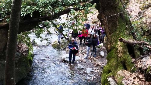 Στη συνέχεια μέσα από μονοπάτι με πλούσια βλάστηση και πλακόστρωτα σημεία φτάσαμε στο ρέμα. Στην ρεματιά της Κουφάλας. Παντού τρεχούμενα, γάργαρα νερά προκαλώντας τον θαυμασμό όλων μας, ένα μέρος της όμορφης ελληνικής φύσης σε φωτογραφίες και την ψυχή μας. Στάση στο εκκλησάκι του Αη Γιώργη και έπειτα επιστροφή στον Άγιο Λαυρέντιο περπατώντας μέσα στα καλντερίμια του χωριού θαυμάζοντας τα πανέμορφα αρχοντικά! Ο καλός καιρός μας επέτρεψε να καθίσουμε έξω στην πλατεία, να φάμε τοπικές νοστιμιές και να πιούμε ωραίο κρασί. Κάποιοι στην επιστροφή επισκέφτηκαν το ιστορικό χωριό Δράκεια όπου υπάρχει το μνημείο των πεσόντων όπου οι Γερμανοί είχαν εκτελέσει τους κατοίκους του χωριού.