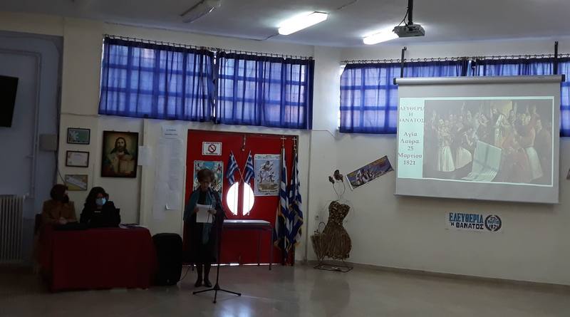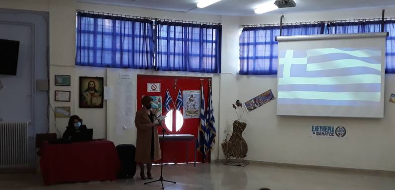 Η προσκεκλημένη κ. Χρυσούλα Κοντογεωργάκη, Πρόεδρος της Φιλαρχαίου Εταιρείας Αλμυρού  “Η Όθρυς”, καθηγήτρια Αγγλικής Φιλολογίας, συγγραφέας, τέως Διευθύντρια του 1ου Γυμνασίου Αλμυρού και του Γυμνασίου Ευξεινούπολης, αναφέρθηκε στη συμμετοχή της περιοχής του Αλμυρού  στην επανάσταση του 1821 και στα επαναστατικά κινήματα μετά το 1830  για την απελευθέρωση του Αλμυρού  από τους Τούρκους και όλης της Θεσσαλίας ως το 1881, καθώς και στο κορυφαίο κίνημα του 1878 στην περιοχή του Αλμυρού, που οδήγησε στην τελική απελευθέρωσή του στις 17 Αυγούστου 1881. Η κ. Κοντογεωργάκη  παρουσίασε μεταξύ άλλων στους μαθητές τους τοπικούς ήρωες και την προσφορά τους στην Επανάσταση του 1821. Αναφέρθηκε στον μεγάλο πολέμαρχο Ιωάννη Βελέντζα, στην εξέγερση  που οργάνωσε και σε πολλούς άλλους καθώς και στη συμβολή των  μοναχών της Παναγίας Ξενιάς στον αγώνα.