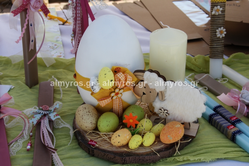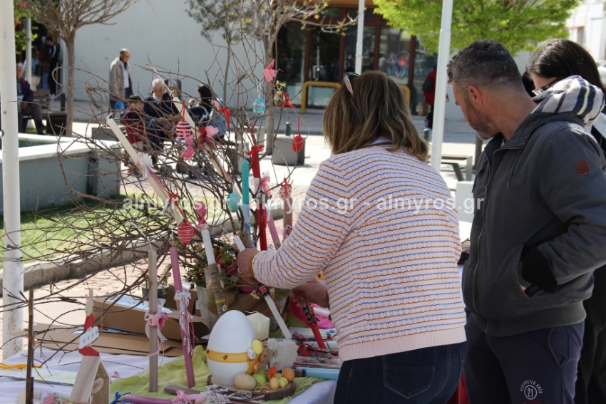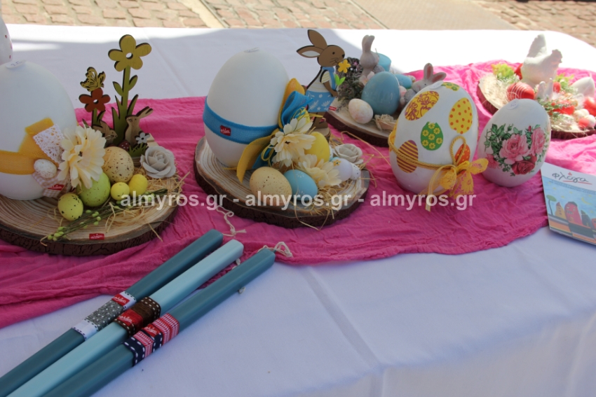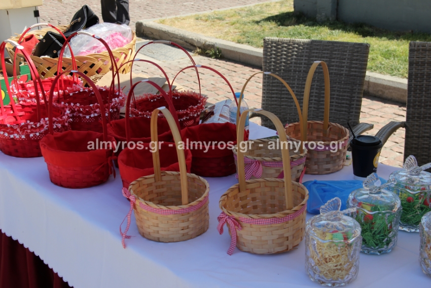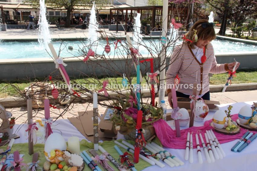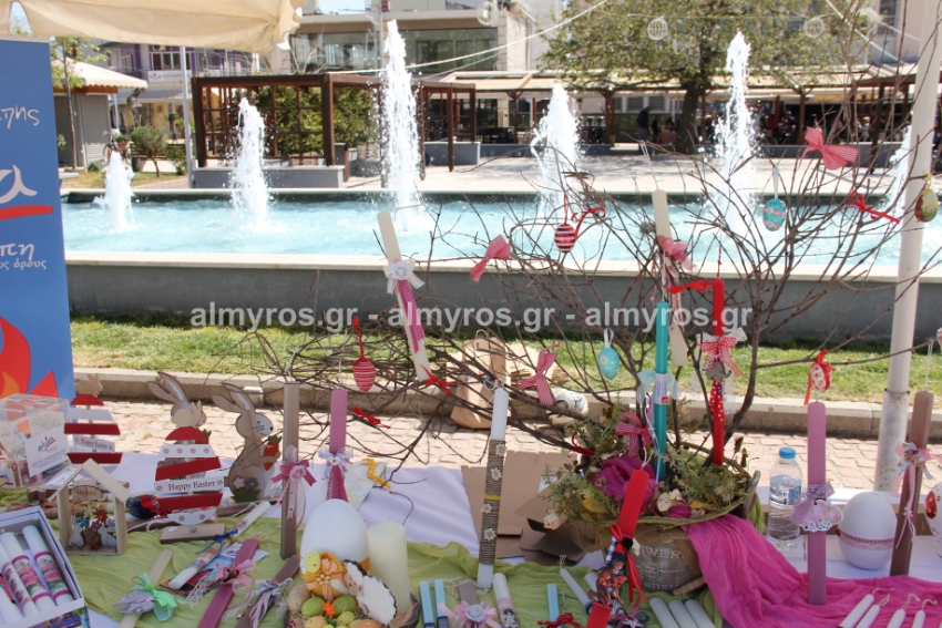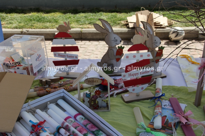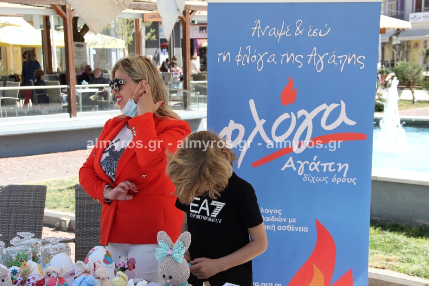 Λαμπάδες, πασχαλινά καλαθάκια, κεντητές δημιουργίες, διακοσμητικά κάθε είδους είχε ο πάγκος που στήθηκε στην κεντρική πλατεία Αλμυρού το πρωί της Παρασκευής 15 Απριλίου από τα μέλη της «Φλόγας», του Συλλόγου Γονιών παιδιών με καρκίνο.
