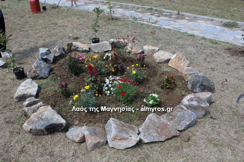 Η πρόεδρος του τοπικού συμβουλίου Βάσω Πυργάνη-Παρασκευοπούλου δεν άφησε το φτυάρι και τον κασμά από το χέρι της, μαζί και ο σύζυγός της Γιώργος, οι πρόσκοποι, μικροί και μεγάλοι, από τη Ν. Αγχίαλο, τα παιδιά από τους συλλόγους Οξυωτών και το 2ο Βαρνάλειο Δημοτικό Σχολείο, η εκπρόσωπος του Φιλοπρόοδου κα Παρθένη. Όλοι συνεισέφεραν στον καλό σκοπό και το ωραίο αποτέλεσμα ήρθε ύστερα από δουλειά σχεδόν δύο ωρών. Πρώτα κουβάλησαν τις μεγάλες πέτρες, μετά άνοιξαν τις τρύπες, φύτεψαν και πότισαν τα λουλούδια και τους θάμνους, τοποθέτησαν τα προστατευτικά καλάμια.