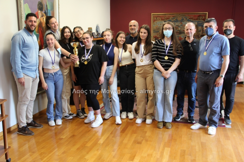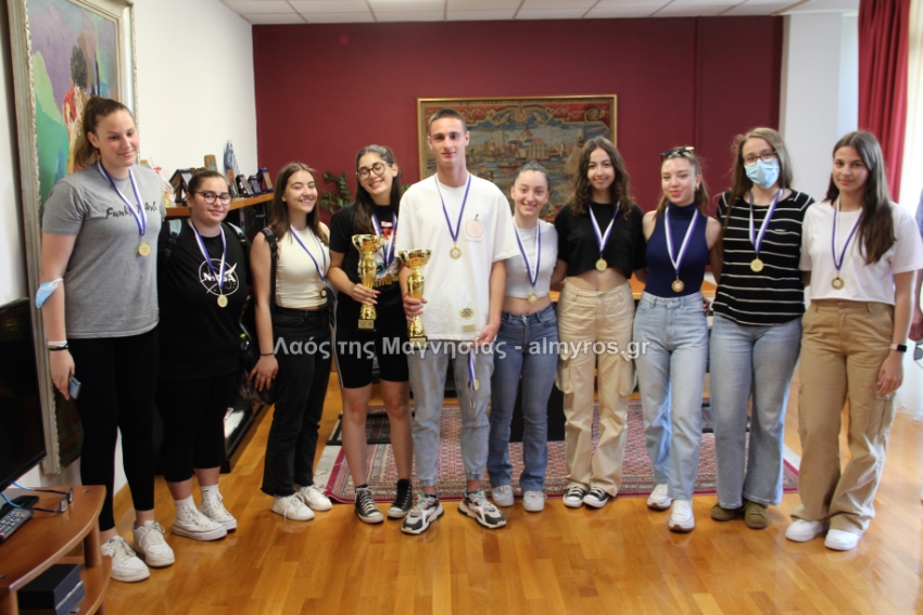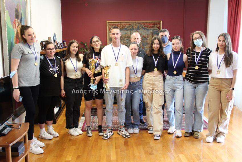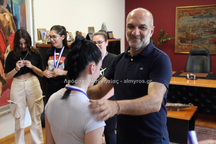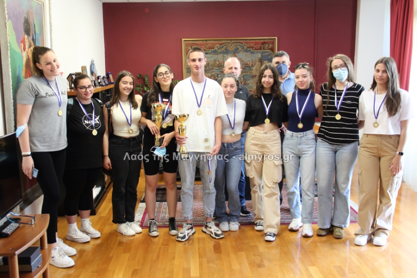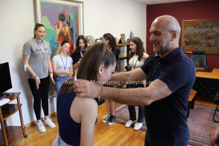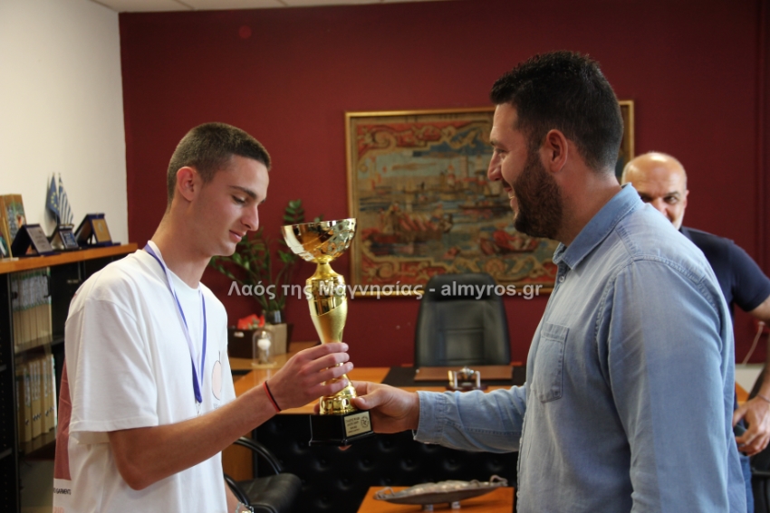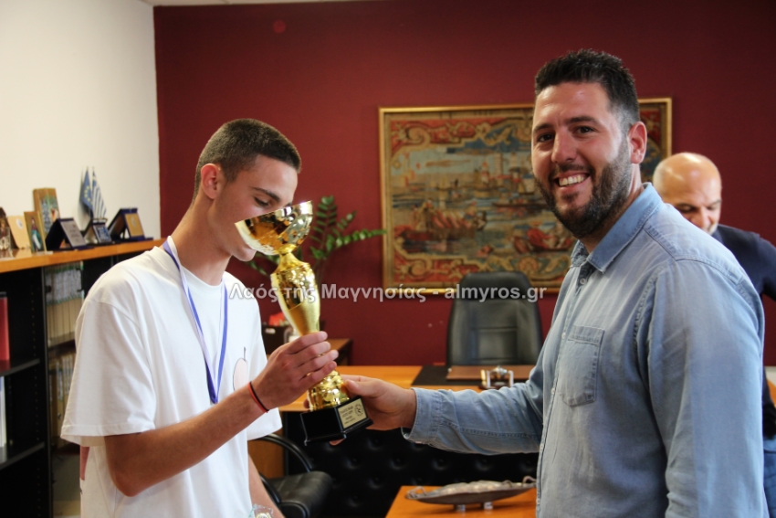Μια ωραία εκδήλωση πραγματοποιήθηκε σήμερα το πρωί (Τρίτη 17 Μαΐου) στο γραφείο του Δημάρχου που γέμισε από παιδικές φωνές κι όμορφα χαμόγελα! Ο Δήμαρχος Αλμυρού Ευάγγελος Χατζηκυριάκος, μαζί με τον Αντιδήμαρχο Λεωνίδα Βούλγαρη και τον πρόεδρο του Συλλόγου Φίλων Κουρί Ιωάννη Δεληζήση υποδέχθηκαν τους μαθητές του Γενικού Λυκείου Αλμυρού που σημείωσαν επιτυχίες στα σχολικά αθλητικά πρωταθλήματα: τα κορίτσια της ομάδας βόλεϊ και τον Σταύρο Κοντοβά που διακρίθηκε στο άλμα εις ύψος.