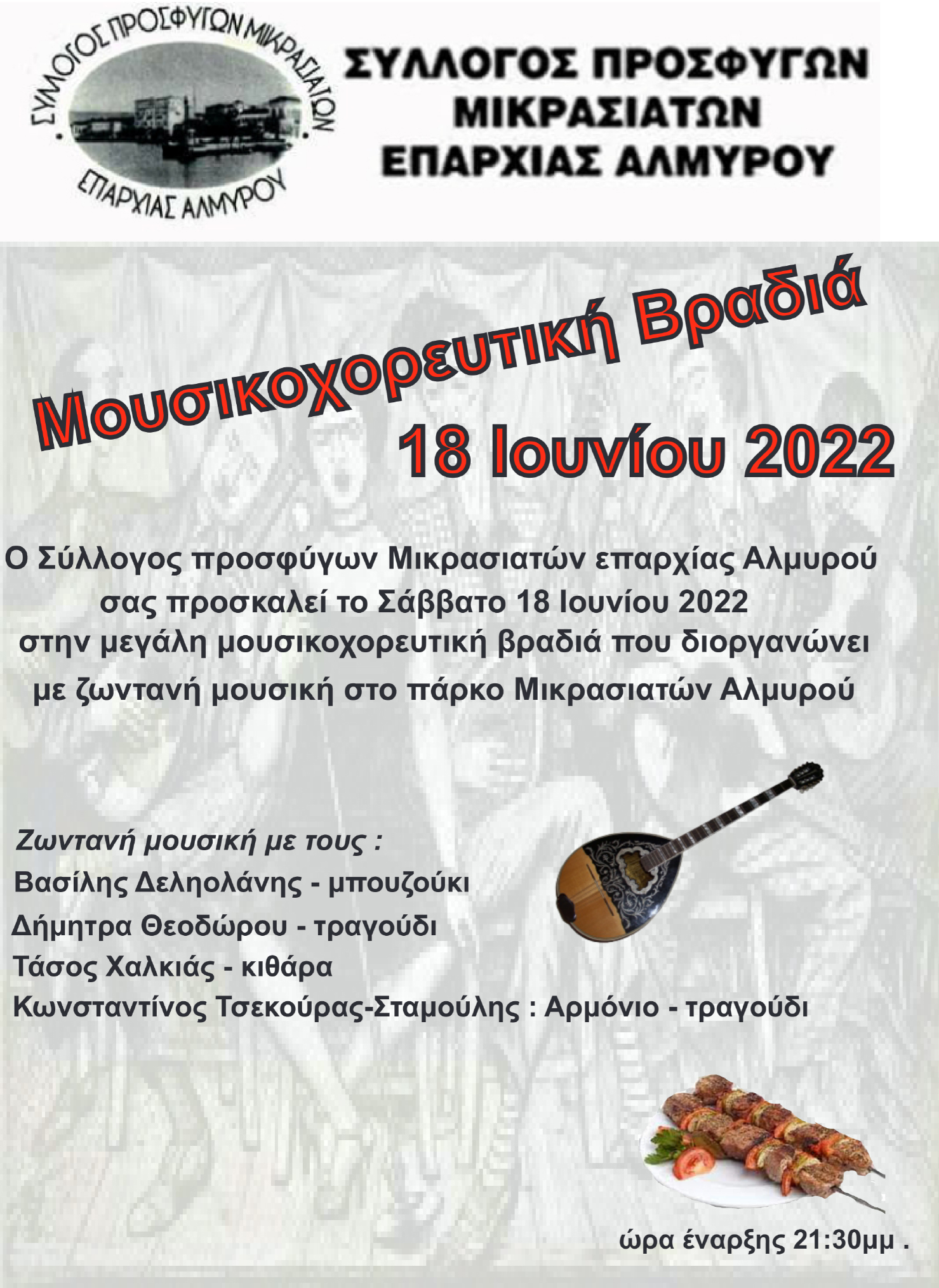 Ο Σύλλογος Προσφύγων Μικρασιατών επαρχίας Αλμυρού καλεί τα μέλη του, και όχι μόνο, το Σάββατο 18 Ιουνίου στη μεγάλη μουσικοχορευτική βραδιά που διοργανώνει με ζωντανή μουσική στο Πάρκο Μικρασιατών.