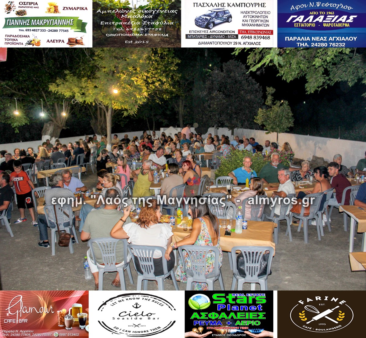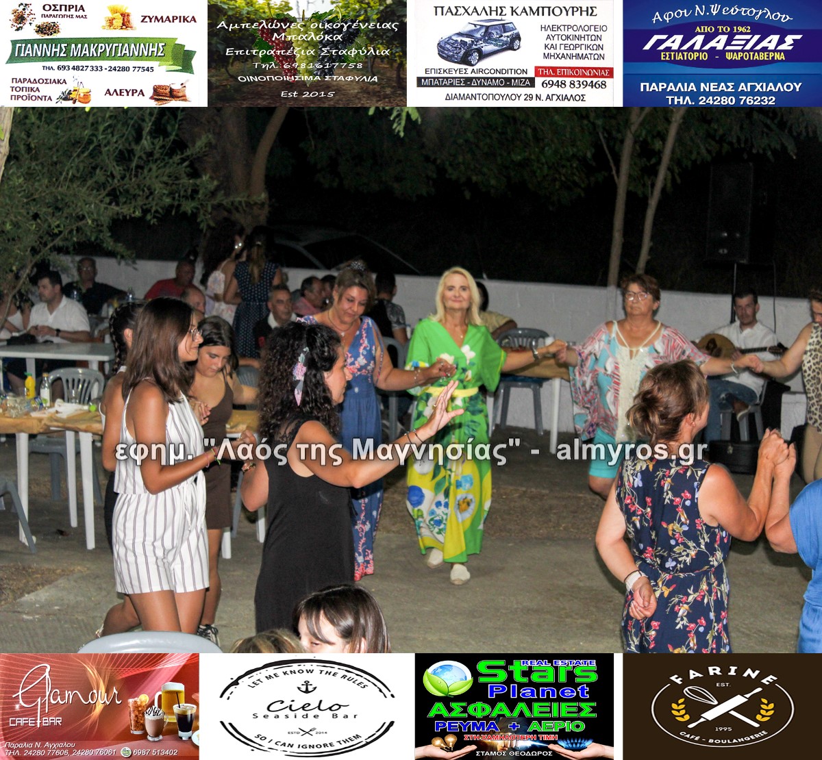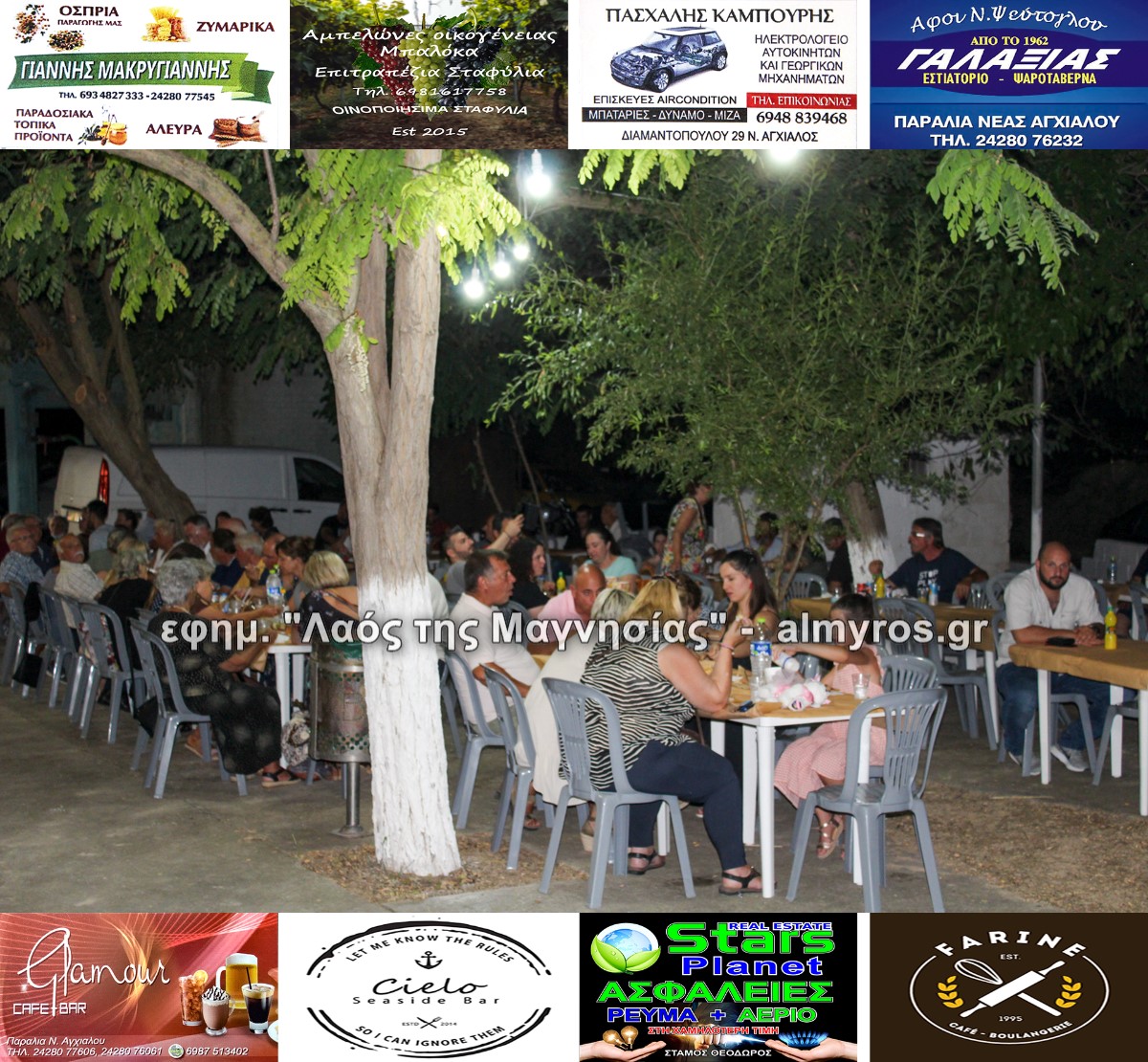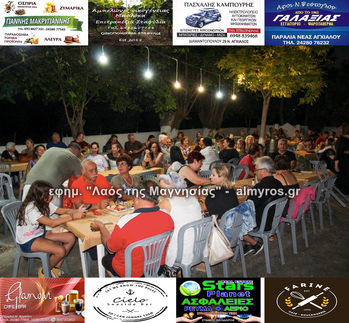 Η ανταπόκριση του κόσμου ήταν τεράστια! Όπως μπορείτε να δείτε στις φωτογραφίες, ο χώρος γέμισε με μέλη του συλλόγου και όχι μόνο… Πρώτα τελέστηκε ο εσπερινός και μετά τις 21:00 άρχισε το γλέντι, με ζωντανή μουσική και πολύ χορό… Η πρόεδρος του Φιλοπρόοδου Συλλόγου Βαλασία Πετρίδη, στον σύντομο χαιρετισμό της, έκανε λόγο για ημέρα μνήμης κι αναβίωσης ενός παραδοσιακού για τους Αγχιαλίτες πανηγύρι. Θυμήθηκε ότι παλιότερα τέτοια ημέρα οι κάτοικοι ξενυχτούσαν στην εκκλησία τρώγοντας και διασκεδάζοντας. Επίσης δεν παρέλειψε να αφιερώσει την εκδήλωση αυτή στη μνήμη της Γιάννας Μπούτλα.