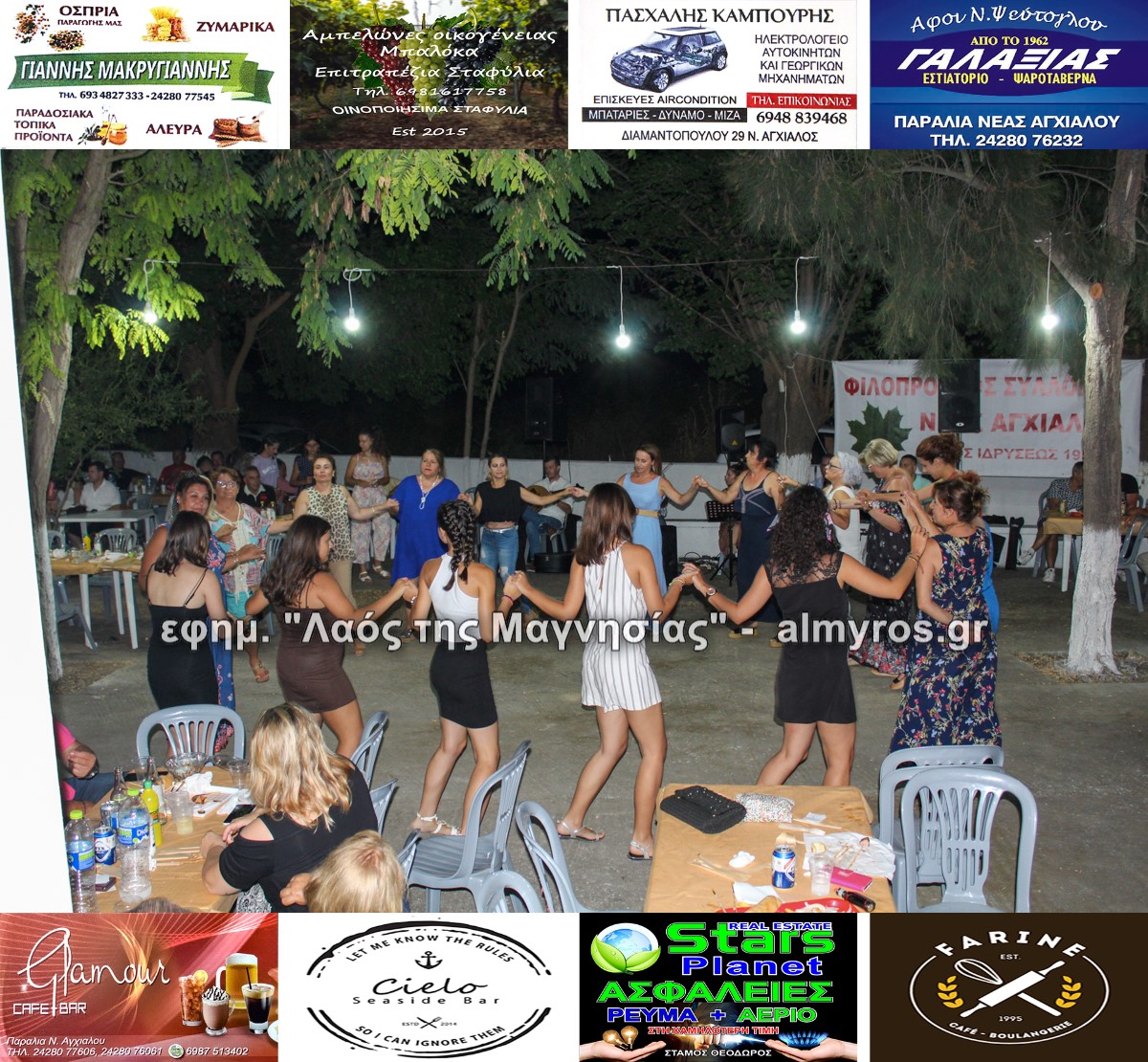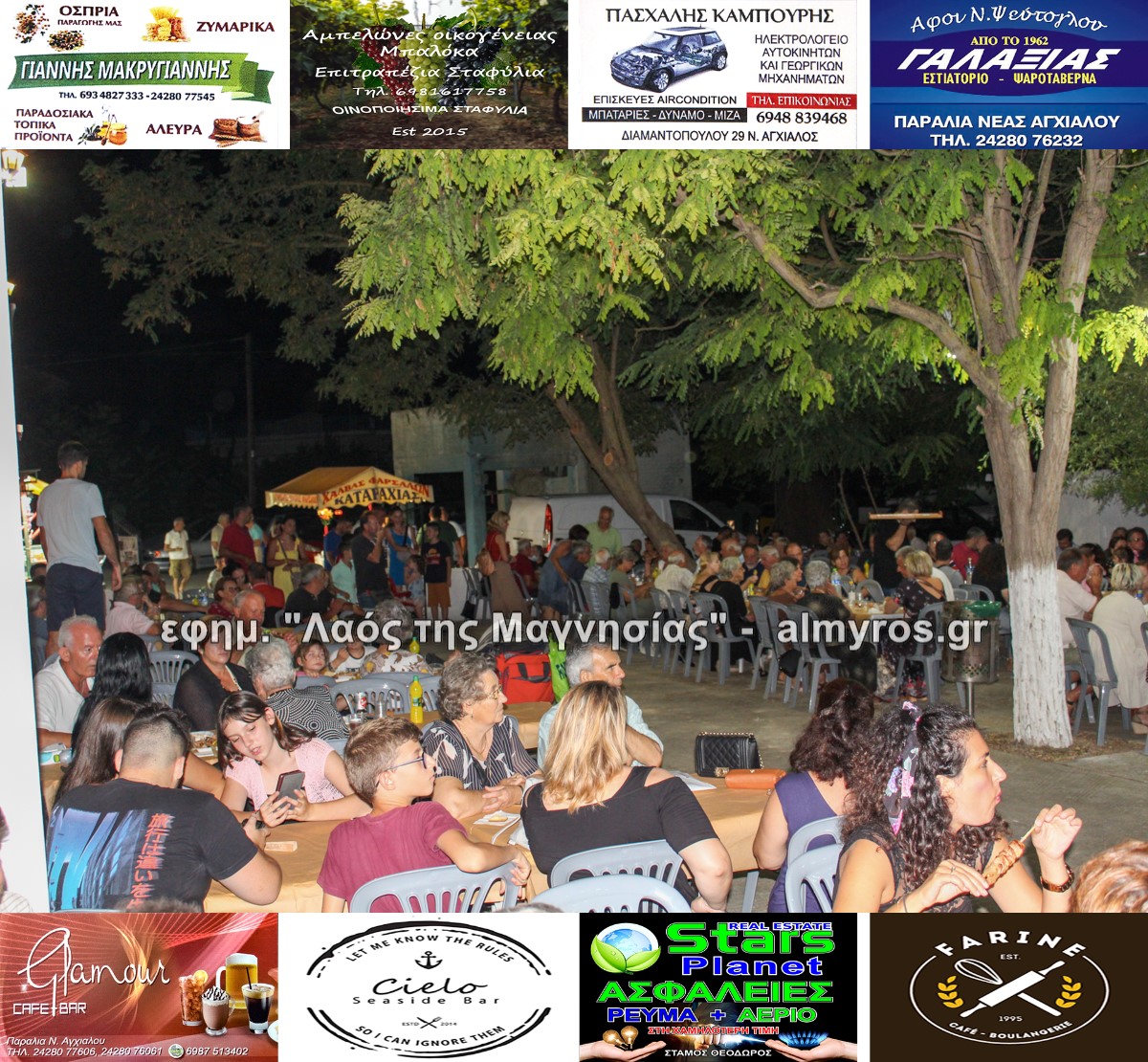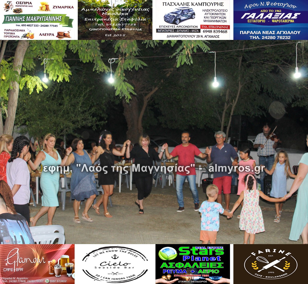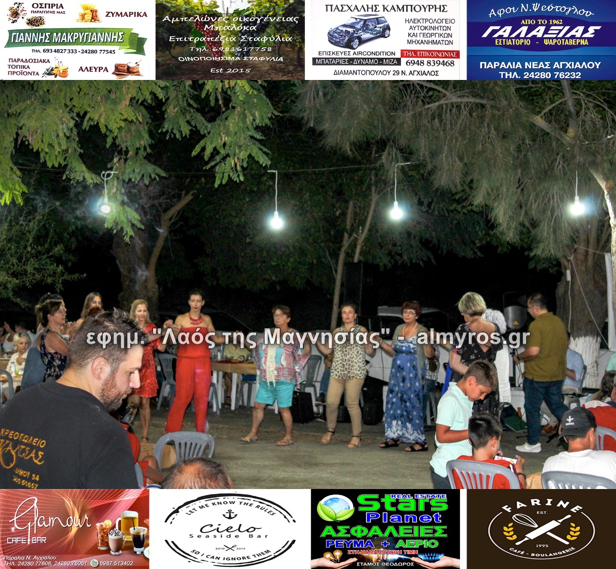 Η ανταπόκριση του κόσμου ήταν τεράστια! Όπως μπορείτε να δείτε στις φωτογραφίες, ο χώρος γέμισε με μέλη του συλλόγου και όχι μόνο… Πρώτα τελέστηκε ο εσπερινός και μετά τις 21:00 άρχισε το γλέντι, με ζωντανή μουσική και πολύ χορό… Η πρόεδρος του Φιλοπρόοδου Συλλόγου Βαλασία Πετρίδη, στον σύντομο χαιρετισμό της, έκανε λόγο για ημέρα μνήμης κι αναβίωσης ενός παραδοσιακού για τους Αγχιαλίτες πανηγύρι. Θυμήθηκε ότι παλιότερα τέτοια ημέρα οι κάτοικοι ξενυχτούσαν στην εκκλησία τρώγοντας και διασκεδάζοντας. Επίσης δεν παρέλειψε να αφιερώσει την εκδήλωση αυτή στη μνήμη της Γιάννας Μπούτλα.