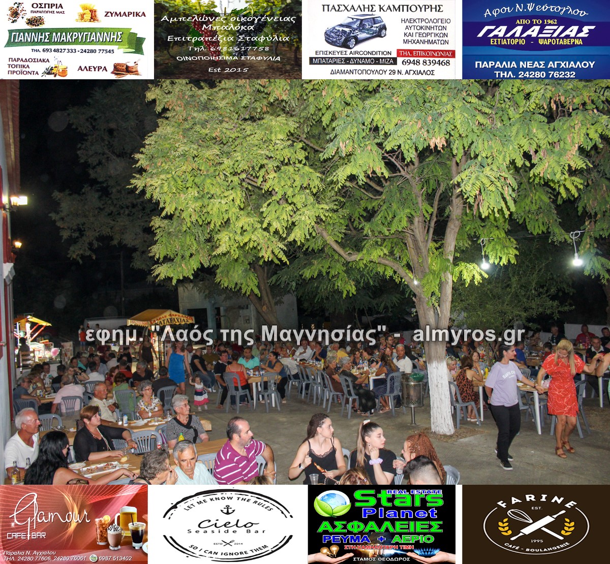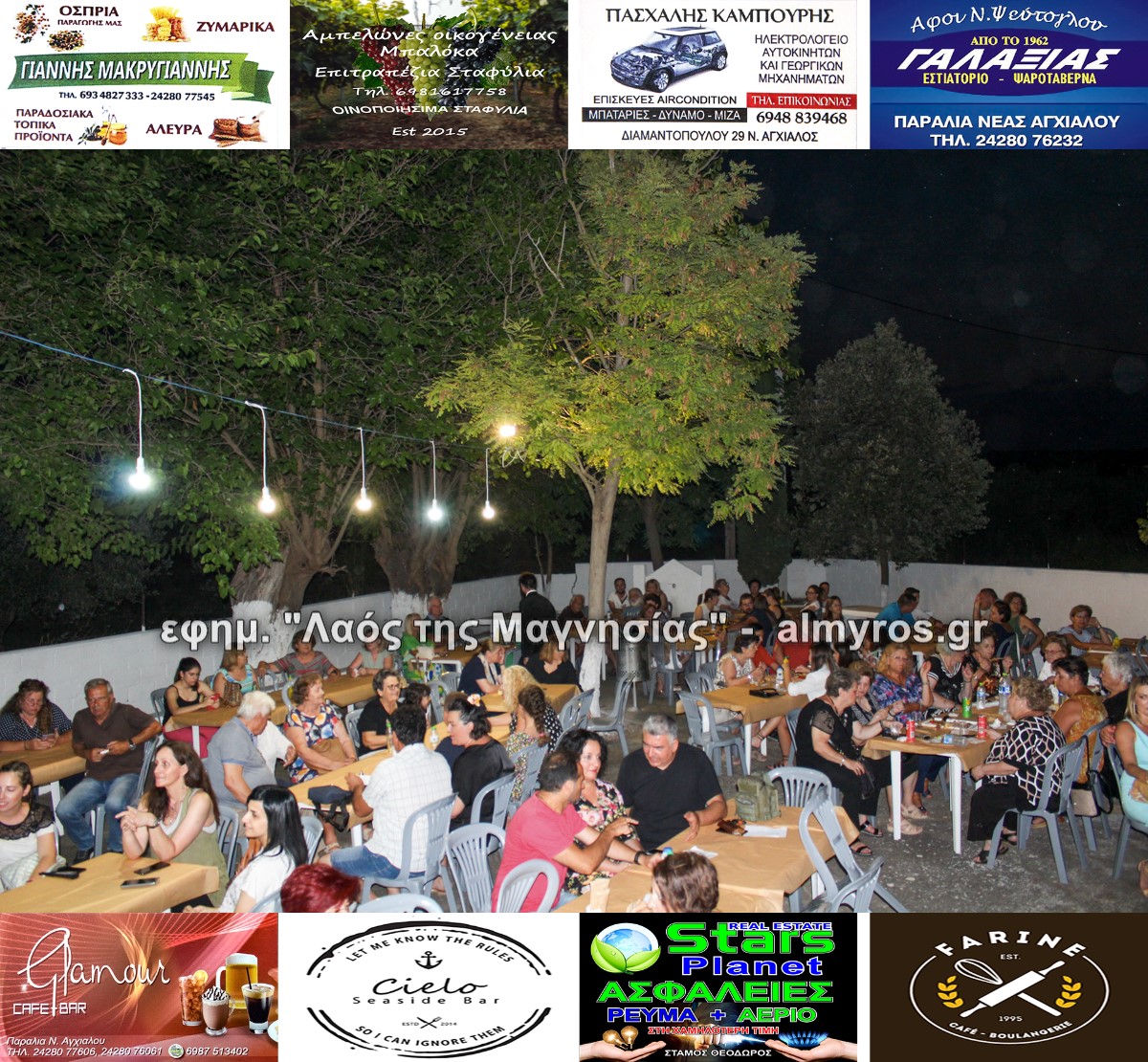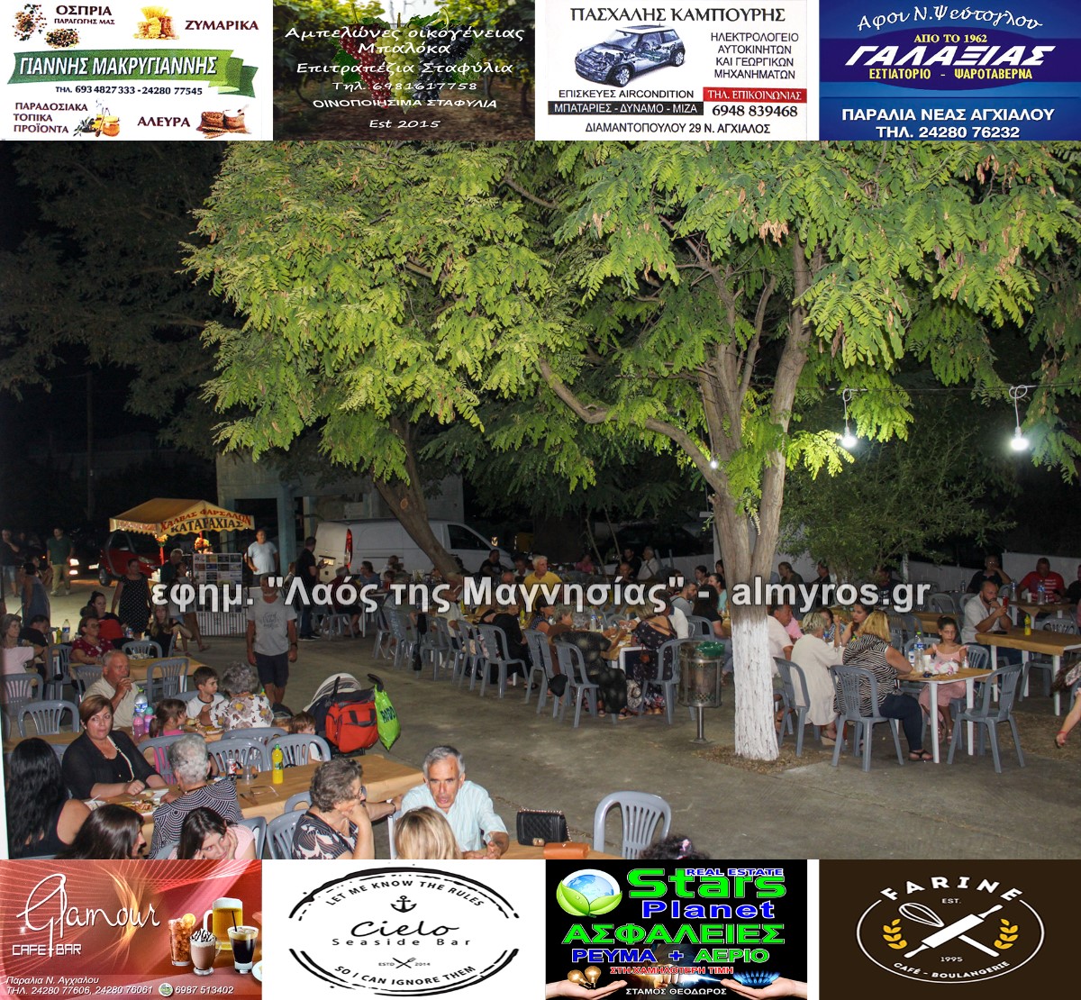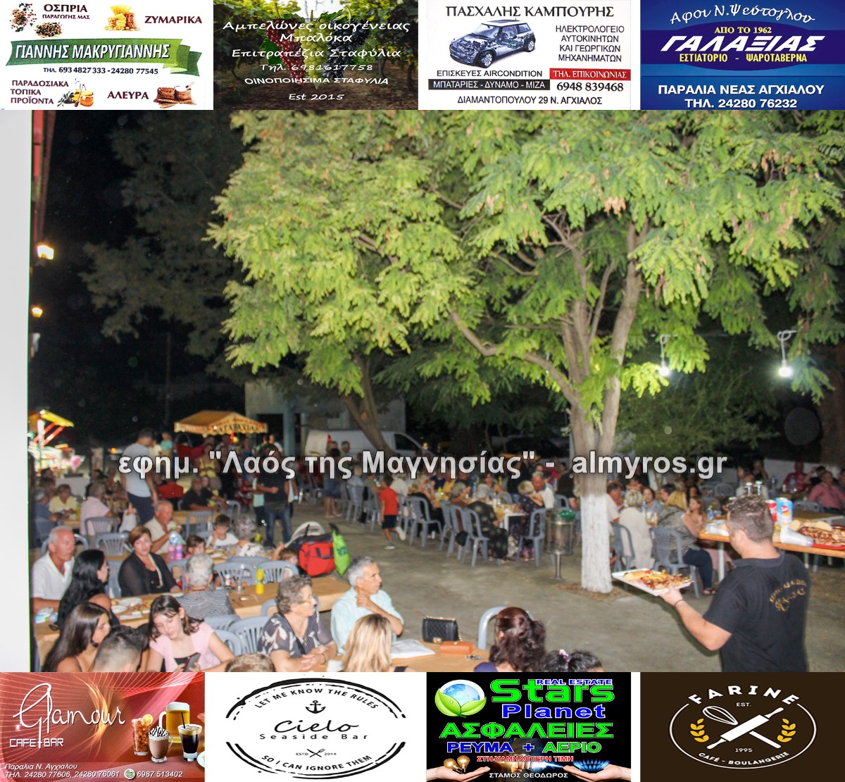 Η ανταπόκριση του κόσμου ήταν τεράστια! Όπως μπορείτε να δείτε στις φωτογραφίες, ο χώρος γέμισε με μέλη του συλλόγου και όχι μόνο… Πρώτα τελέστηκε ο εσπερινός και μετά τις 21:00 άρχισε το γλέντι, με ζωντανή μουσική και πολύ χορό… Η πρόεδρος του Φιλοπρόοδου Συλλόγου Βαλασία Πετρίδη, στον σύντομο χαιρετισμό της, έκανε λόγο για ημέρα μνήμης κι αναβίωσης ενός παραδοσιακού για τους Αγχιαλίτες πανηγύρι. Θυμήθηκε ότι παλιότερα τέτοια ημέρα οι κάτοικοι ξενυχτούσαν στην εκκλησία τρώγοντας και διασκεδάζοντας. Επίσης δεν παρέλειψε να αφιερώσει την εκδήλωση αυτή στη μνήμη της Γιάννας Μπούτλα.