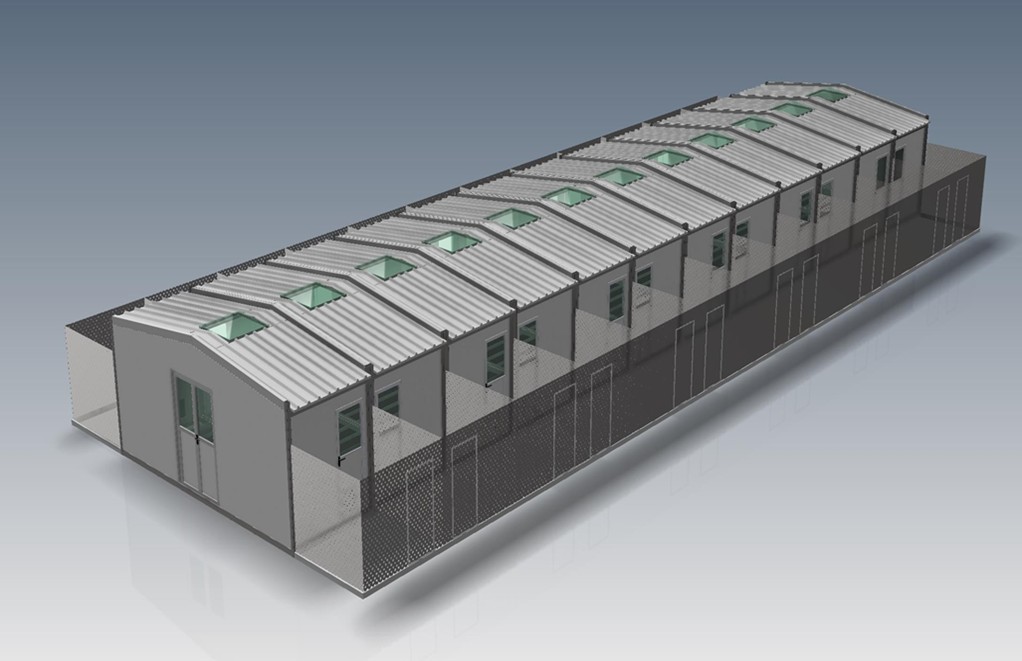 Το κτίριο φιλοξενίας των ζώων θα αποτελείται από μονάδες διαστάσεως 2,10μ. x 5,86μ. x 2,30 μ. (εσωτερικό καθαρό ύψος) και 2,59-2,89μ. (εξωτερικό καθαρό ύψος). Θα Διαθέτει δυο (2) εξωτερικές δίφυλλες πόρτες με σταθερή τζαμαρία στο ήμισυ , μια σε κάθε άκρη του κτιρίου. Ο τελικός αριθμός των μονάδων καθορίζεται ανάλογα με τις ανάγκες του κάθε καταφυγίου. Η κάθε μονάδα διαθέτει τον χώρο για να εξυπηρετήσει δύο (2) ζώα. Οι διαστάσεις του κάθε κελιού θα είναι όχι λιγότερες από 2,00μ. x 2,00μ.