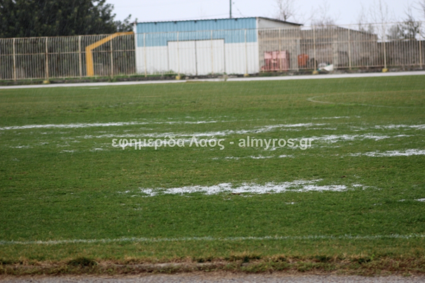 Στο στάδιο Αλμυρού το μπουρίνι πριν την έναρξη του ματς είχε ως αποτέλεσμα ο αγωνιστικός χώρος να κρατήσει πολύ νερό. Ο διαιτητής Καλαντζής νωρίς εξέφρασε την άποψη ότι δεν θα έπρεπε να ξεκινήσει το ματς όταν επιθεώρησε το τερέν, οι ομάδες βγήκαν κανονικά για προθέρμανση αλλά άρχισε να βρέχει πιο δυνατά.