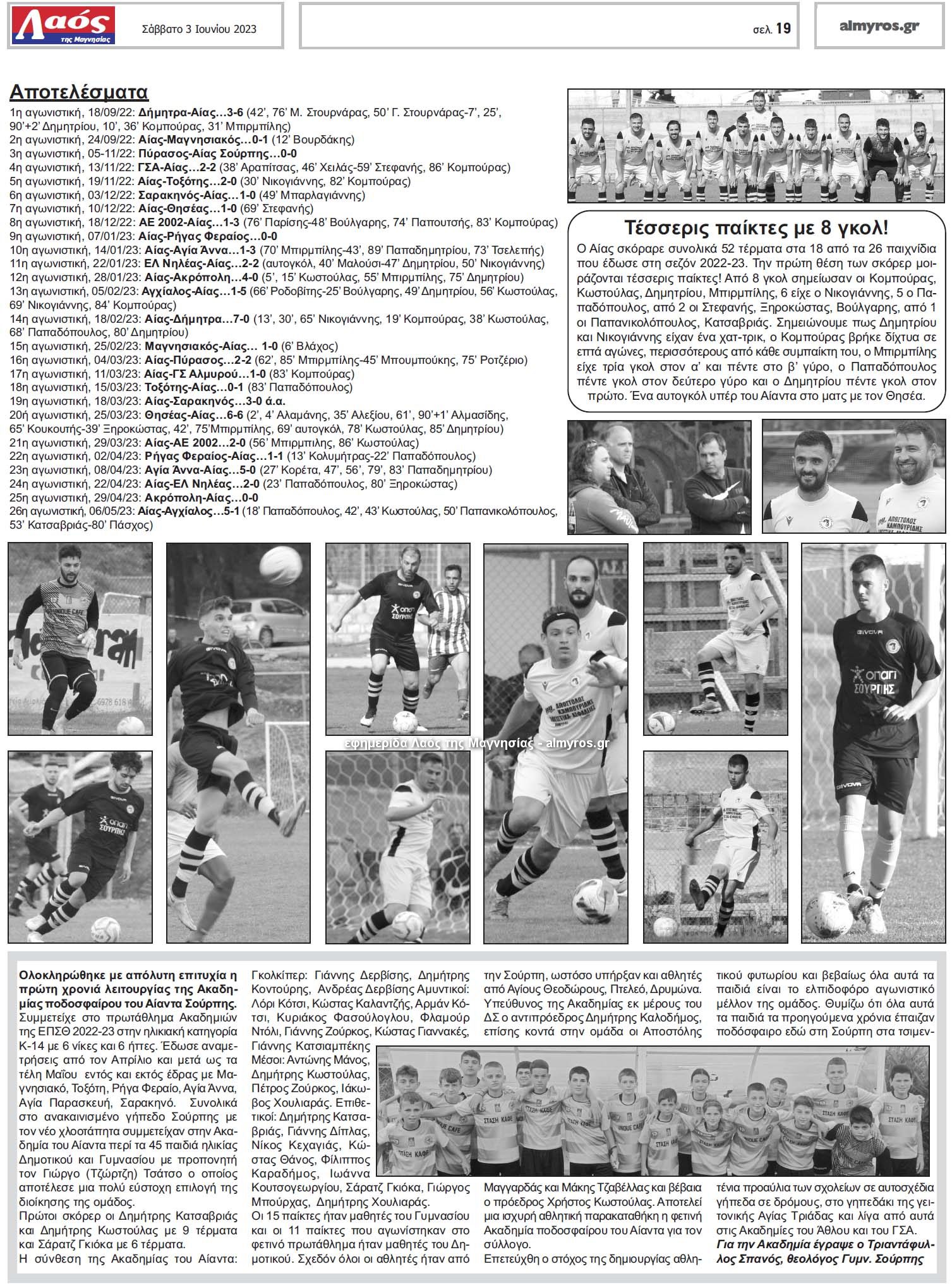 26η αγωνιστική, 06/05/2023: Αίας-Αγχίαλος…5-1 (18’ Παπαδόπουλος, 42’, 43’ Κωστούλας, 50’ Παπανικολόπουλος, 53’ Κατσαβριάς-80’ Πάσχος)