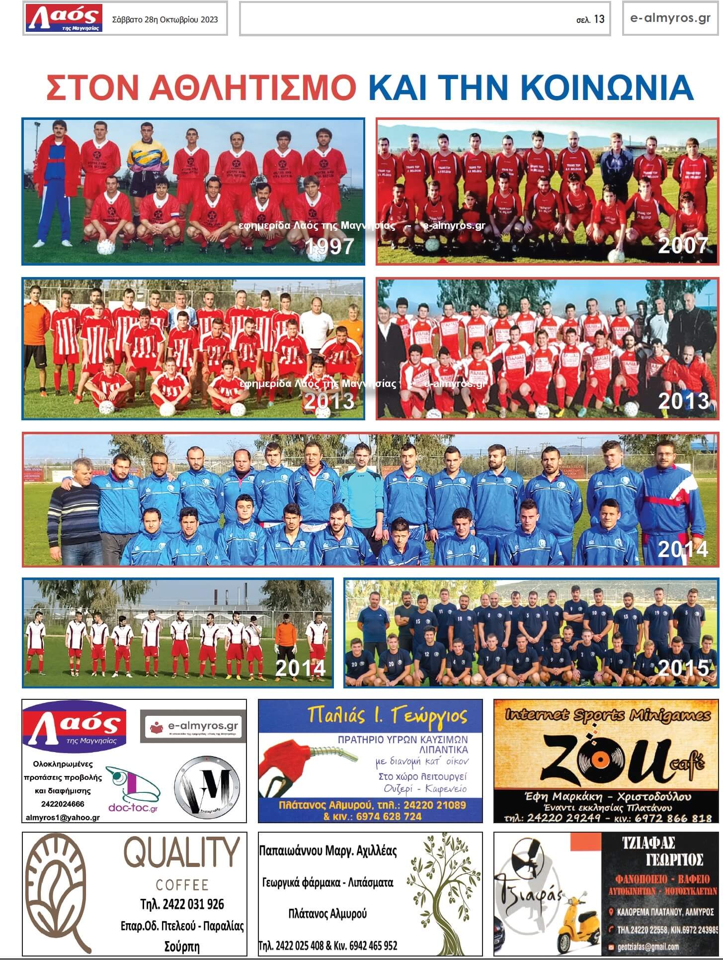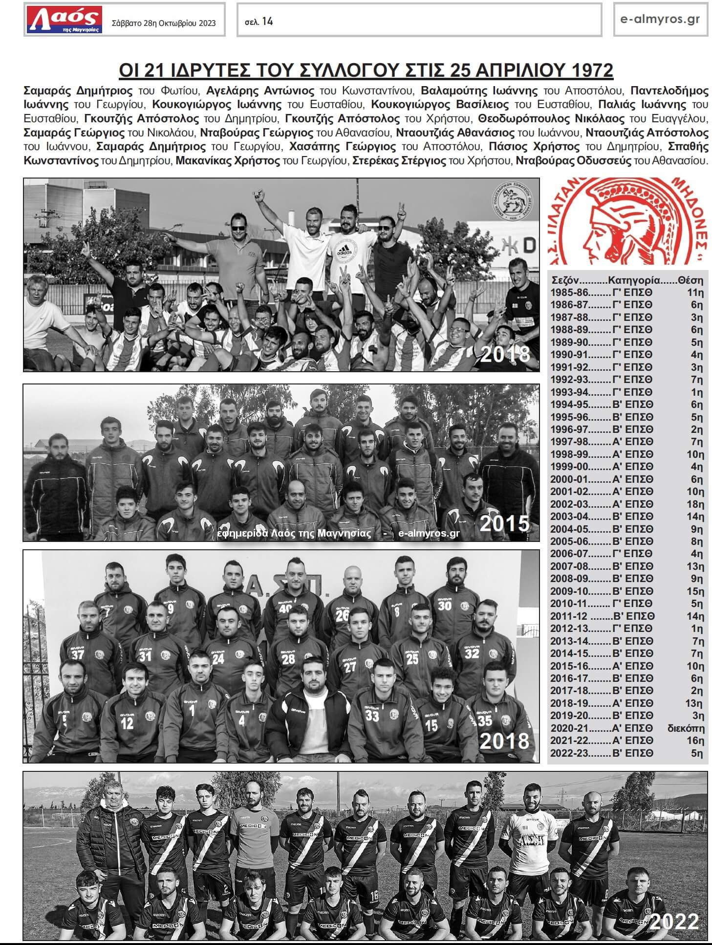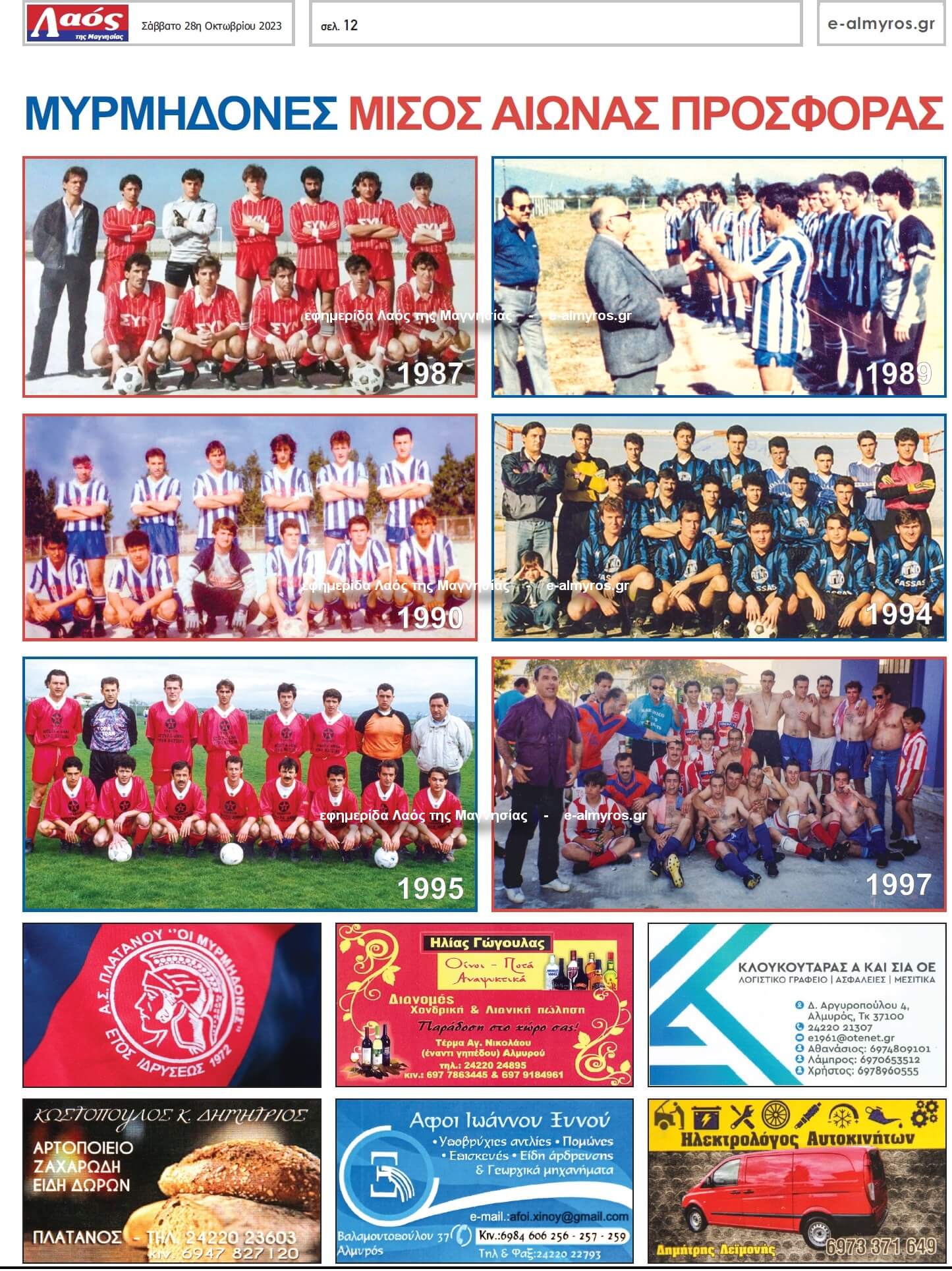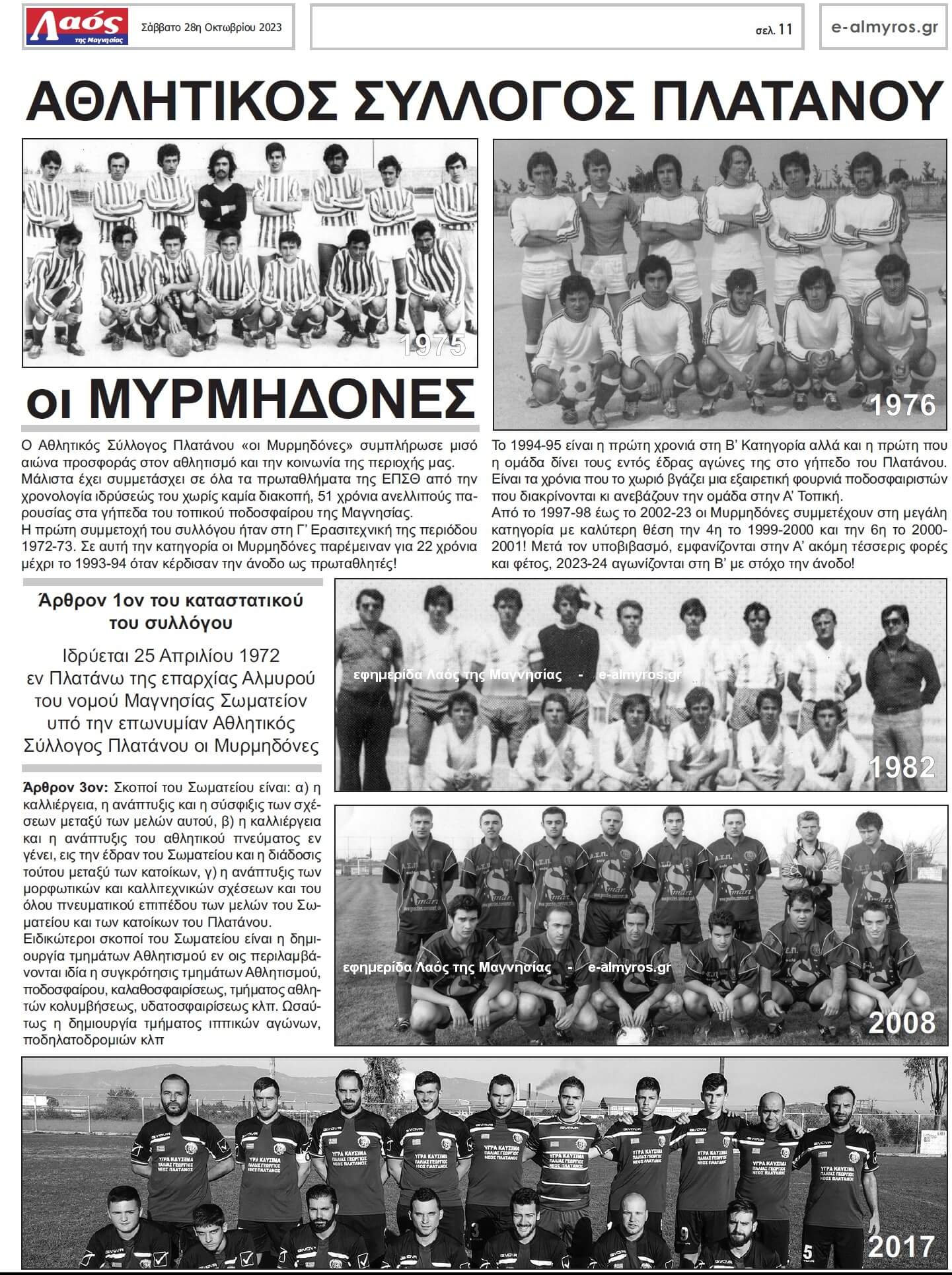 Στην εφημερίδα “Λαός της Μαγνησίας” που κυκλοφόρησε στις 28 Οκτωβρίου 2023 φιλοξενήσαμε τετρασέλιδο αφιέρωμα στην ιστορία των Μυρμηδόνων Πλατάνου που συμπλήρωσαν τον μισό αιώνα ζωής.