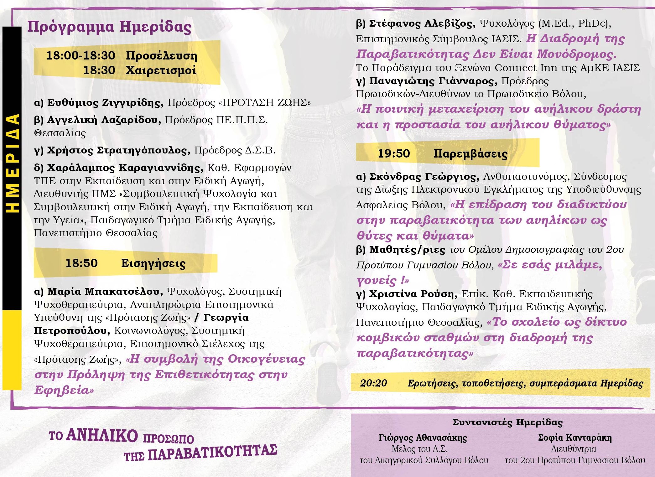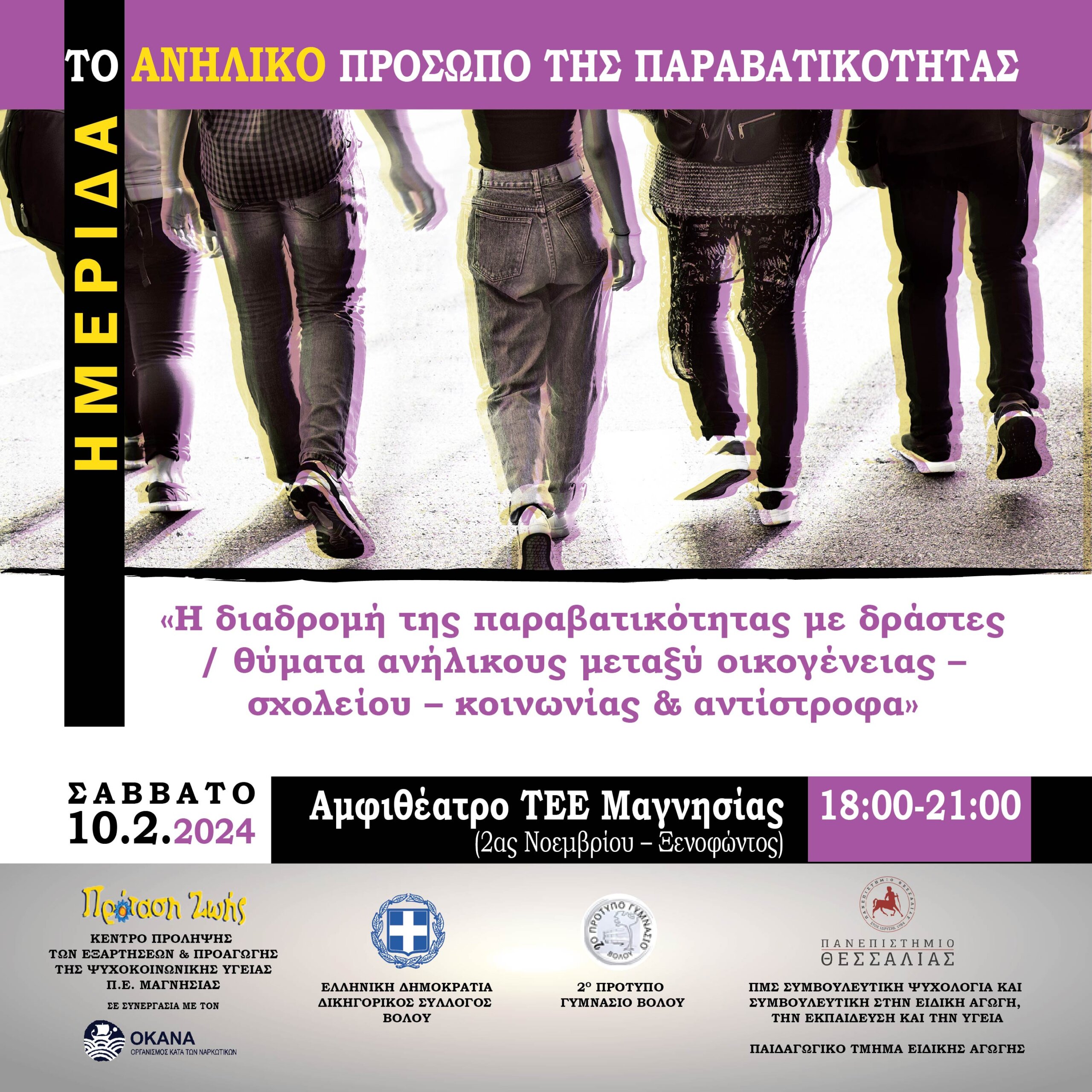 Ημερίδα συνδιοργανώνουν το απόγευμα του Σαββάτου 10 Φεβρουαρίου οι φορείς: Κέντρο Πρόληψης «Πρόταση Ζωής», Δικηγορικός Σύλλογος Βόλου, 2ο Πρότυπο Γυμνάσιο Βόλου, Παιδαγωγικό Τμήμα Ειδικής Αγωγής του Πανεπιστημίου Θεσσαλίας.