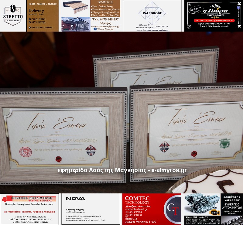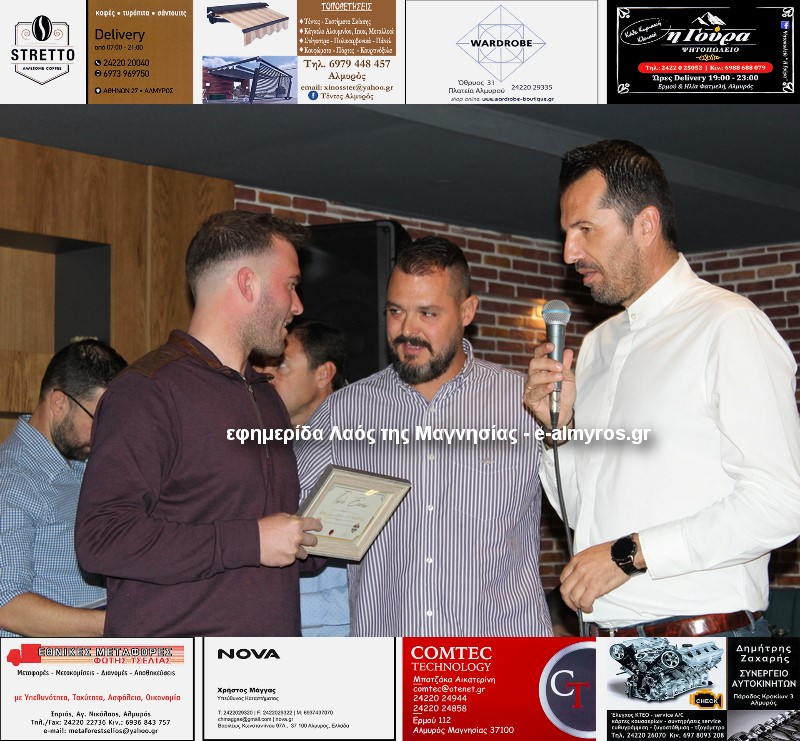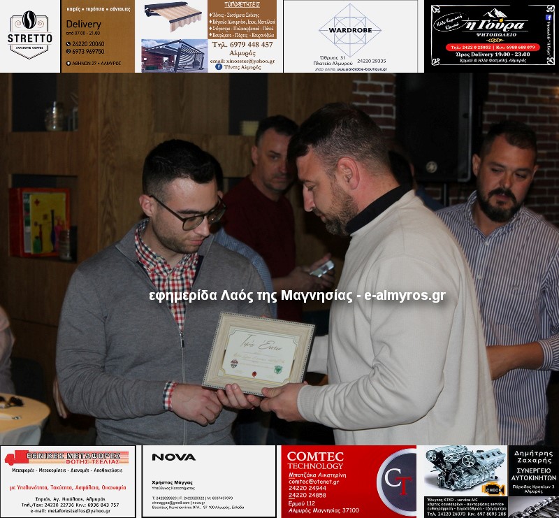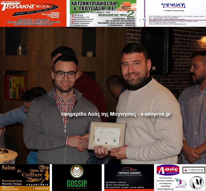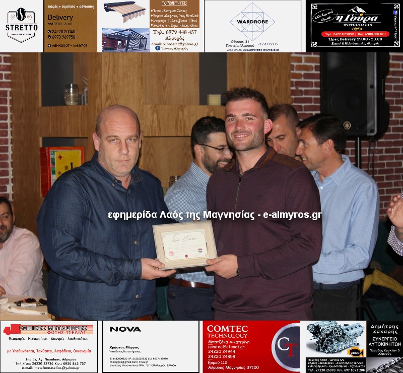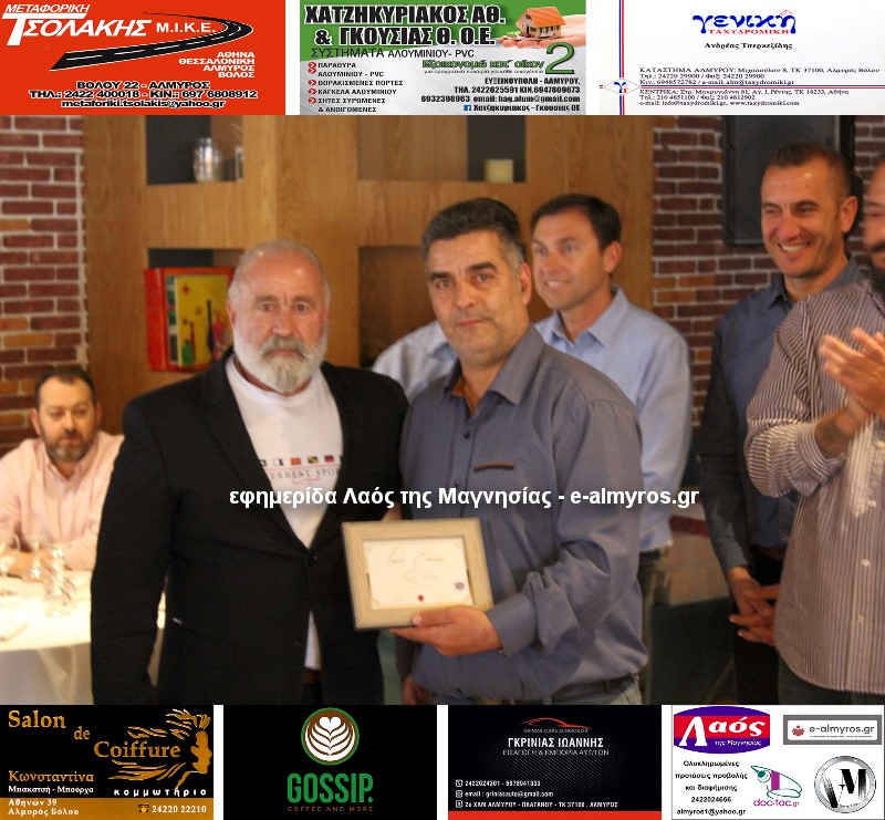 Αξίζει να σημειώσουμε ότι έγιναν τρεις βραβεύσεις. Οι υπεύθυνοι της Almyros Football Arena τίμησαν με καλαίσθητο αναμνηστικό τον Γεώργιο Λιάκο για την αφιλοκερδή προσφορά του. «Είναι δίπλα μας από το ξεκίνημα και μας έχει βοηθήσει πολύ με προσωπική δουλειά» ανέφερε ο Μιχάλης Ανδρωνάς. Την απονομή έκανε ο πρόεδρος της Κοινότητας Ευξεινούπολης Μηνάς Παπαγιάννης.