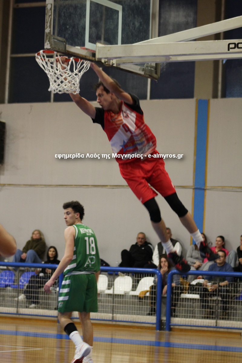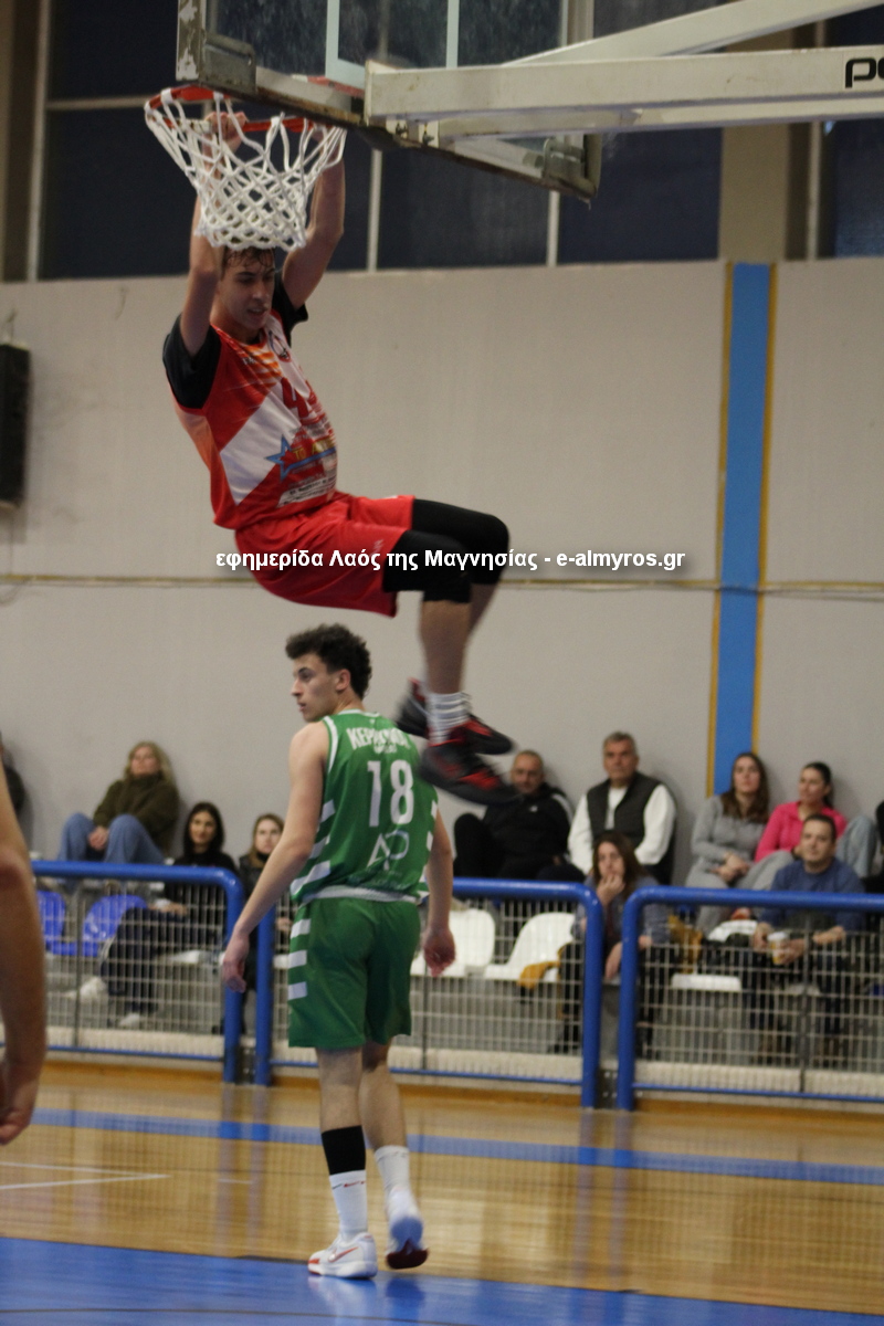 Για τον Δημήτρη Κολοκύθα, τον νεαρό ταλαντούχο αθλητή των Τιτάνων έχουμε γράψει πολλές φορές ότι διαθέτει προσόντα και ξεχωρίζει στην ερυθρόλευκη ομάδα. Στο σημερινό ματς με τον Κεραυνό, έβαλε 36 πόντους με έξι εύστοχα τρίποντα, πέντε δίποντα και έξι ελεύθερες βολές. Είχε τέσσερα γκολ-φάουλ! (το ένα σε τρίποντο, στο ένα έχασε τη βολή) και πρόσφερε αρκετές εντυπωσιακές φάσεις με το δυνατό πάτημα και το μεγάλο άλμα του. Ήταν αυτός που έβαλε το τελευταίο καλάθι του αγώνα και το έκανε με κάρφωμα! Δεν ήταν το πρώτο του στο πρωτάθλημα, αλλά το πρώτο που εμείς αποτυπώσαμε σε φωτογραφίες…