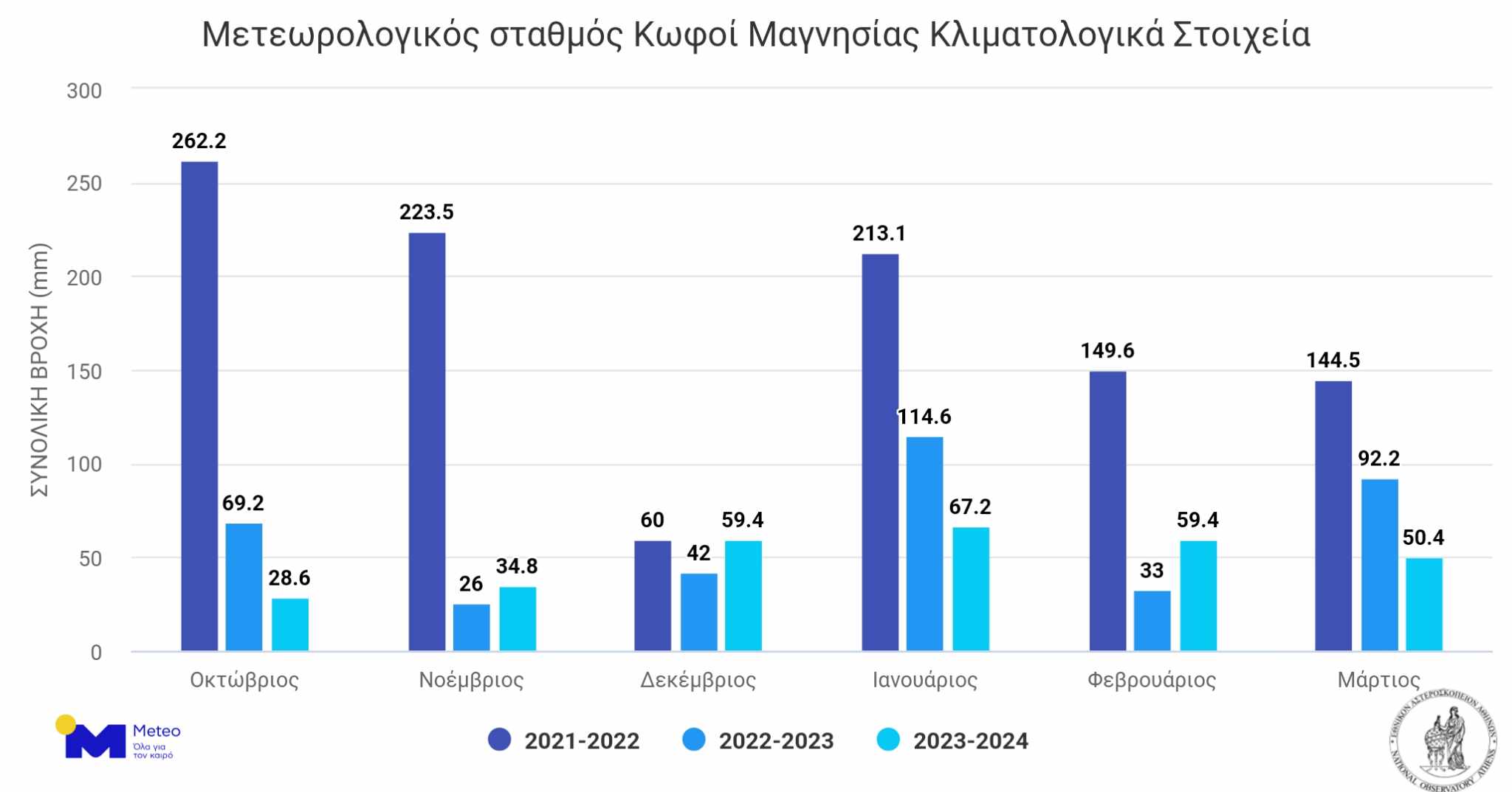 Σχετικά με τη βροχή, εδώ η διαφορά είναι ακόμη μεγαλύτερη. Από τα 262,2 mm συνολικής βροχής τον Οκτώβριο του 2022 πήγαμε στα 28,6 τον ίδιο μήνα το φετινό φθινόπωρο. Στα ίδια επίπεδα κυμαίνεται μόνο ο Δεκέμβριος των τελευταίων τριών ετών, τους άλλους μήνες υπάρχουν μεγάλες αποκλίσεις. Αθροιστικά, το διάστημα Οκτωβρίου-Μαρτίου 2021-22 έπεσαν 1.052,9 mm βροχή, το ίδιο εξάμηνο του 2022-23 είχαμε 377mm και φέτος λιγότερα από 300.