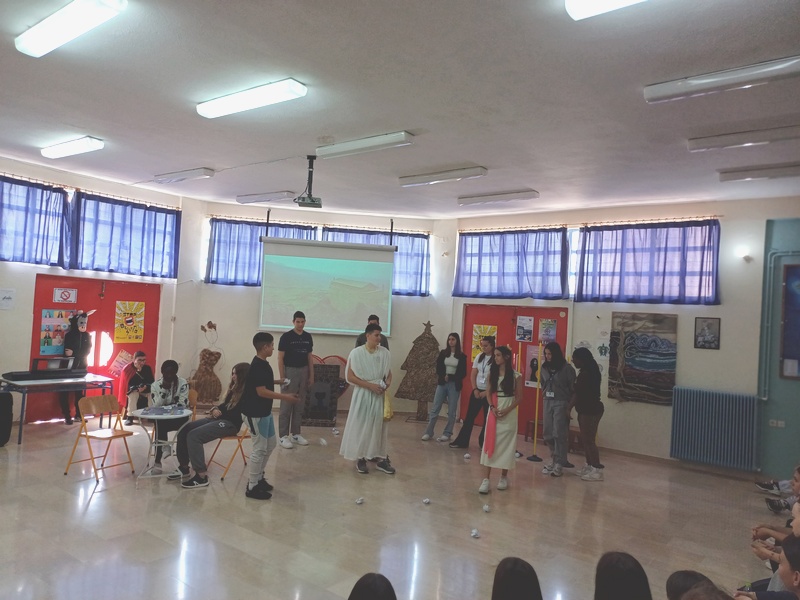 Μία από τις δράσεις  κατά τη διάρκεια της επίσκεψης ήταν η παρουσίαση τοπικών μύθων μας στους επισκέπτες (Ιάσονας και Αργοναυτική εκστρατεία, Κένταυροι, Τιτάνες, Δευκαλίωνας και Πύρρα). Με τη σειρά τους,  μας παρουσίασαν τοπικές τους παραδόσεις και έναν μύθο (η Γέφυρα του Διαβόλου). Με έμπνευση από το υλικό αυτό, η ομάδα Erasmus που αποτελούνταν από 6 Ισπανούς και 8  Έλληνες μαθητές συνέγραψε (με την βοήθεια και καθοδήγηση των καθηγητών τους), ένα μικρό σπονδυλωτό θεατρικό έργο συνδέοντας το παρόν με το παρελθόν,  το οποίο και παρουσίασαν στη σχολική μας κοινότητα, ενώ η παράσταση βιντεοσκοπήθηκε για να παρουσιαστεί και στο Institut Torreforta. Παρόλη την πίεση του χρόνου η ομάδα Erasmus έγραψε τα τρία σκετς του έργου, βρήκε τα κουστούμια με τη συνδρομή του Πολιτιστικού Συλλόγου Ευξεινούπολης και ιδιαίτερα της κας Χρ. Μαρδάκη την οποία ευχαριστούμε πολύ, έφτιαξε το προσωπείο ενός γαϊδάρου, επένδυσε ηχητικά το όλο έργο και με πρόβες μόλις μίας ημέρας κατάφερε να παρουσιάσει ένα εξαιρετικό αποτέλεσμα.
