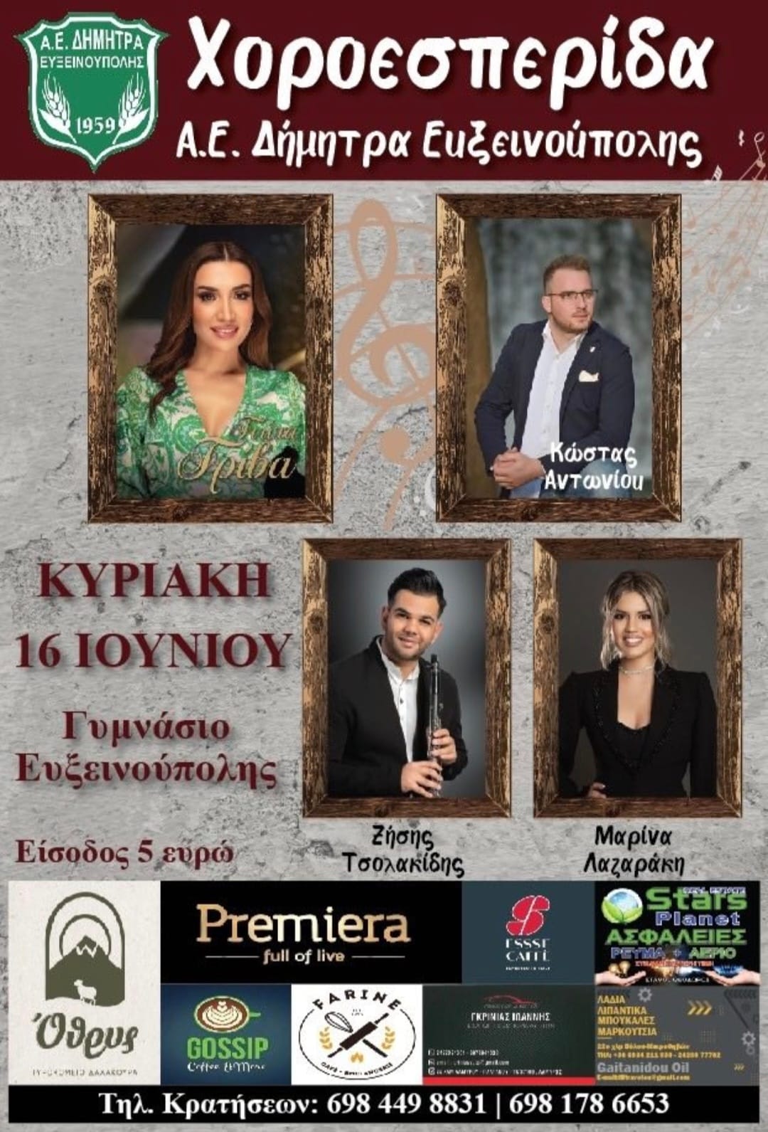 Η Δήμητρα Ευξεινούπολης διοργανώνει καλοκαιρινή χοροεσπερίδα, την Κυριακή 16 Ιουνίου στον προαύλιο χώρο του Γυμνασίου Ευξεινούπολης με γνωστου΄ς καταξιωμένους καλλιτέχνες στο τραγούδι!