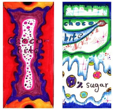 Όσο αφορά τη σοκολάτα, που αποτελεί την αδυναμία των περισσότερων παιδιών και τον “εφιάλτη” των περισσότερων γονιών, προτείνεται η αντικατάσταση της ζάχαρης ή των γλυκαντικών με καλή ποιότητα μελιού ή χυμό φρούτων και η χρήση της κανέλας. Να χρησιμοποιείται πολύ καλή ποιότητα κακάο, ελαίων και να μη περιέχει χρωστικές και συντηρητικά ή άλλα τεχνητά πρόσθετα. Για τη μείωση του κόστους αλλά και της ποσότητας κατανάλωσης, η σοκολάτα να είναι λεπτή και κούφια στο εσωτερικό, σχηματίζοντας αγαπημένους ήρωες, όπως στα μακαρόνια ή γεωμετρικά σχήματα. Στο εσωτερικό, η σοκολάτα να έχει δώρο έκπληξη. Να γίνεται χρήση έντονων χρωμάτων στη συσκευασία και να έχει χαμηλό οικολογικό αποτύπωμα. Το αγελαδινό γάλα μπορεί, ανά περίπτωση, να αντικατασταθεί από άλλα είδη γάλακτος, όπως ρυζιού που. Η παρασκευή της σοκολάτας να γίνεται σε ασφαλές περιβάλλον για να αποφεύγονται τα ίχνη από αλλεργιογόνα. Κάποιες χρωματικές προτάσεις μαθητών για τη συσκευασία φαίνονται παρακάτω.