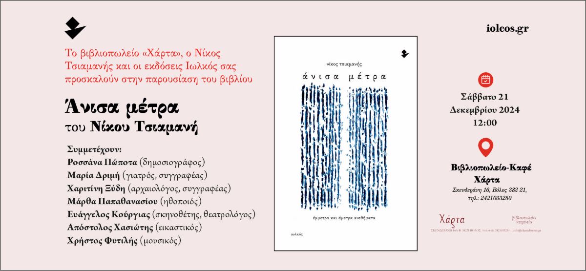 Τα “Άνισα Μέτρα”, του Νίκου Τσιαμανή, Εκδόσεις Ιωλκός, ξεκινούν το ταξίδι τους στον φιλόξενο χώρο του βιβλιοπωλείου Χάρτα στον Βόλο, το Σάββατο 21 Δεκεμβρίου στις 12:00.