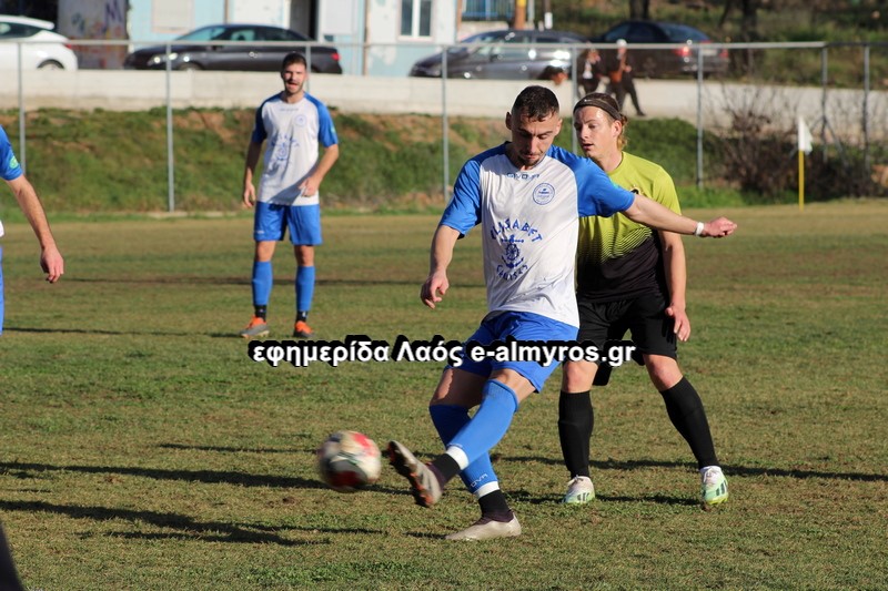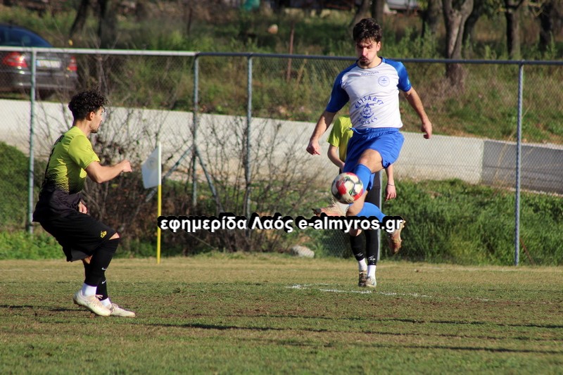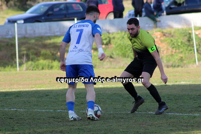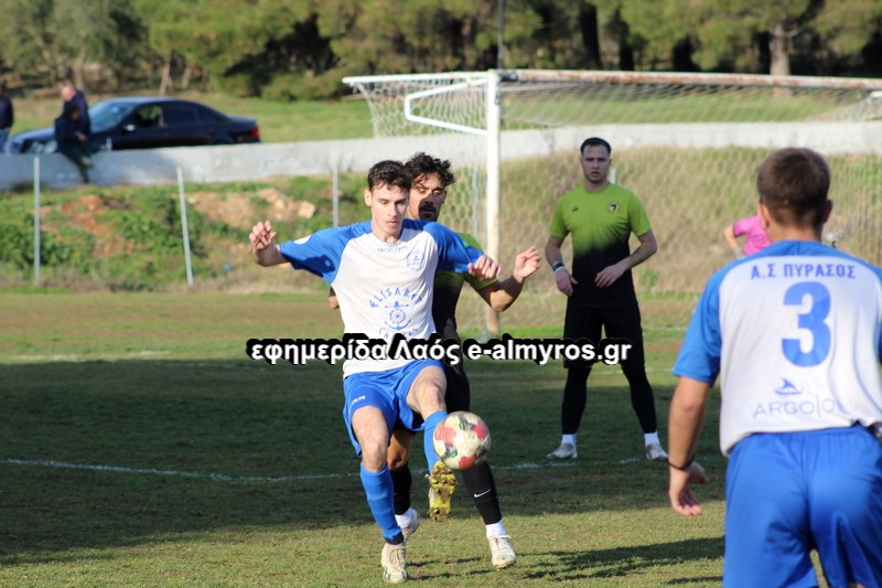 Στην πρώτη καλή φάση άνοιξε το σκορ, για τον Πύρασο στο 17ο λεπτό. Ο αμυντικός Λαφάρας μεταβίβασε την μπάλα στον προωθημένο Τόγια, αυτός πέρασε κάθετη και ο Καραγιώργος σκόραρε με σουτ, στην πλάτη της άμυνας μέσα στη μεγάλη περιοχή.