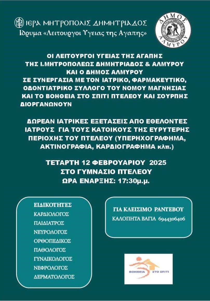 Δωρεάν ιατρικές εξετάσεις διοργανώνουν στον Πτελεό για τους κατοίκους της ευρύτερης περιοχής, την Τετάρτη 12 Φεβρουαρίου 2025, το Ίδρυμα «Λειτουργοί Υγείας της Αγάπης» της Ιεράς Μητρόπολης Δημητριάδος & Αλμυρού και ο Δήμος Αλμυρού σε συνεργασία με τον Ιατρικό, Φαρμακευτικό και Οδοντιατρικό Σύλλογο Ν. Μαγνησίας και το «Βοήθεια στο Σπίτι» Πτελεού και Σούρπης.