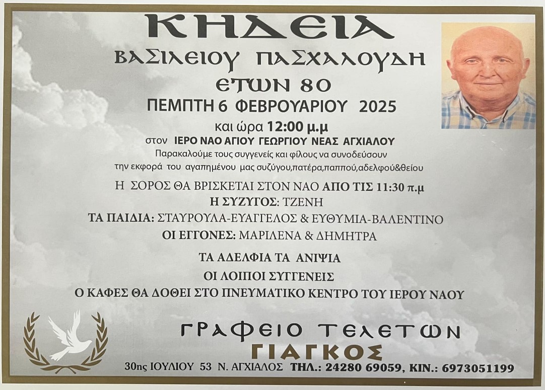Σε ηλικία 80 ετών έφυγε από τη ζωή ο Βασίλειος Πασχαλούδης. Η κηδεία θα γίνει από τον Ιερό Ναό Αγίου Γεωργίου Νέας Αγχιάλου στις 12:00 της Πέμπτης 6 Φεβρουαρίου.