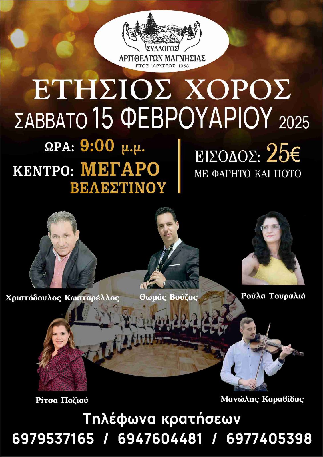 Ο Σύλλογος Αργιθεατών Ν. Μαγνησίας προσκαλεί όλους τους πατριώτες και φίλους του Συλλόγου στον ετήσιο χορό, που θα πραγματοποιηθεί το Σάββατο 15 Φεβρουαρίου 2025 και ώρα 21:00μμ. στο κέντρο ΜΕΓΑΡΟ Βελεστίνου. Τιμή πρόσκλησης 25 ευρώ/άτομο (στην τιμή περιλαμβάνεται πλήρες μενού και απεριόριστο κρασί), με την συνοδεία της πολυμελούς ζωντανής ορχήστρας, παραδοσιακής μουσικής.