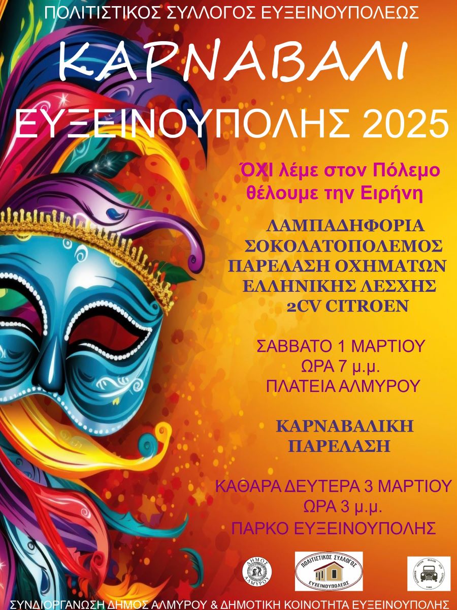 Φέτος το καρναβάλι μας σύνθημα ένα δίνει, όχι λέμε στον πόλεμο, θέλουμε την ειρήνη και το θέμα του Καρναβαλιού μας για το 2025 είναι: «ΟΧΙ στον Πόλεμο ΝΑΙ στην Ειρήνη».