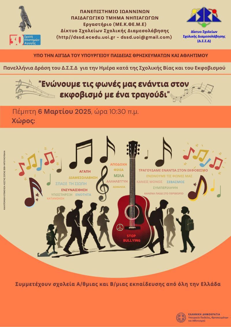 Η εκδήλωση, με τίτλο “Ενώνουμε τις φωνές μας ενάντια στον εκφοβισμό με ένα τραγούδι”, θα περιλαμβάνει τη συμμετοχή σχολείων από όλη την Ελλάδα, τα οποία έχουν δημιουργήσει το καθένα το δικό του πρωτότυπο τραγούδι με στίχους που προάγουν τη συμπερίληψη και την αλληλεγγύη. Οι μαθητές θα παρουσιάσουν τα τραγούδια τους  στον χώρο του σχολείου τους, μεταδίδοντας μέσα από τη μουσική ένα ισχυρό μήνυμα κατά της σχολικής βίας και του εκφοβισμού. Παράλληλα, θα πραγματοποιηθούν δημιουργικές δράσεις όπως ζωγραφική προσφέροντας στους μαθητές επιπλέον ευκαιρίες να εκφράσουν τις σκέψεις και τα συναισθήματά τους για το ζήτημα.