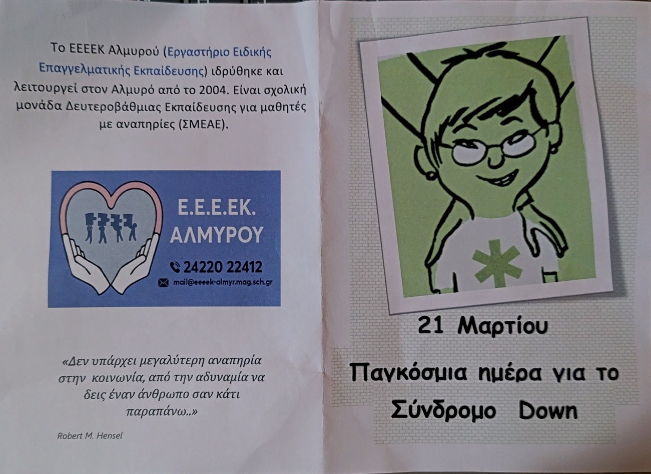 Το Εργαστήριο Ειδικής Επαγγελματικής Εκπαίδευσης και Κατάρτισης (Ε.Ε.Ε.ΕΚ.) Αλμυρού, με αφορμή την Παγκόσμια Ημέρα Συνδρόμου Down στις 21 Μαρτίου, πραγματοποίησε δράση ενημέρωσης και ευαισθητοποίησης της τοπικής κοινωνίας.