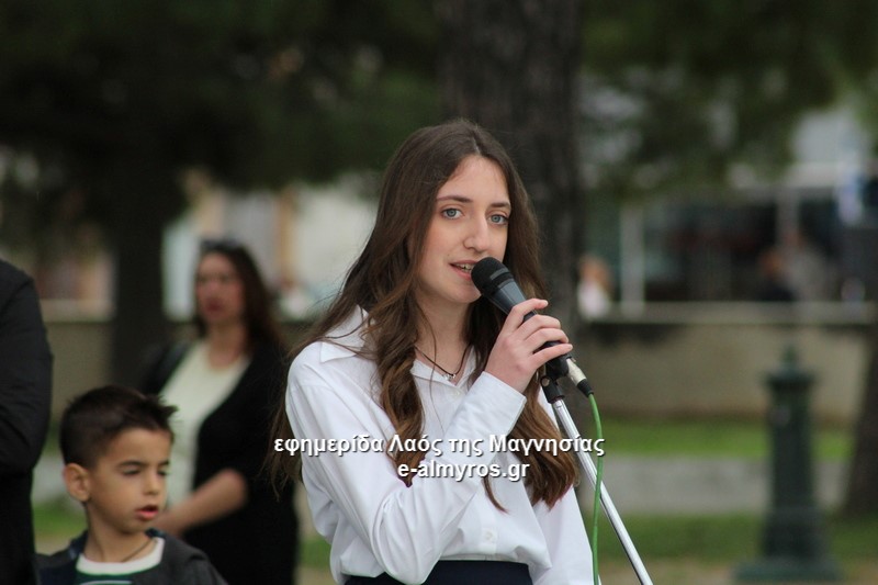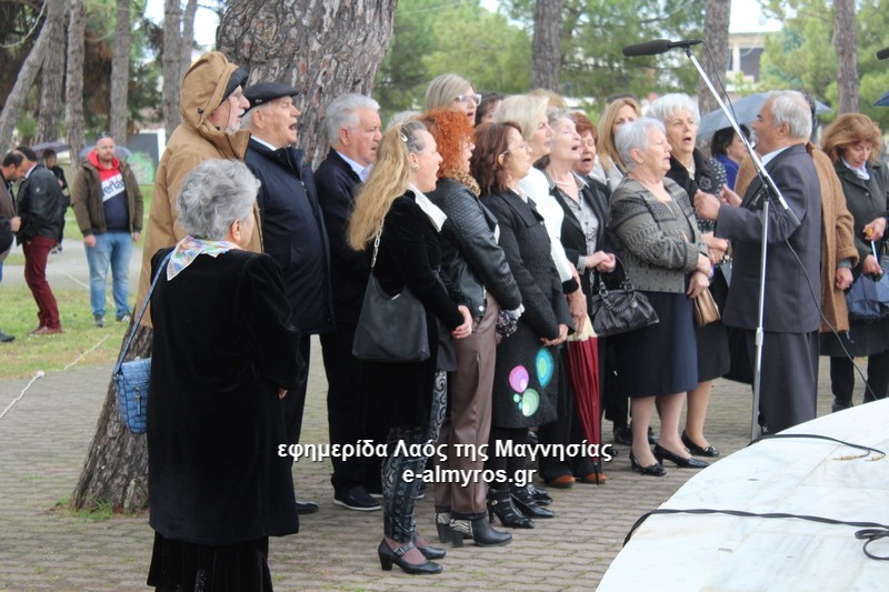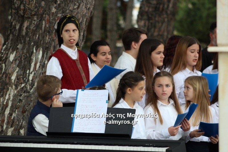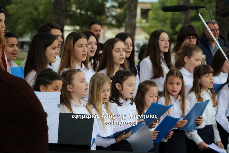 Παιδιά της παιδικής και εφηβικής χορωδίας των Ιερών Ναών Αγίου Ραφαήλ και Αγίου Γεωργίου παρουσίασαν τραγούδια της ημέρας, τηρήθηκε ενός λεπτού σιγή υπέρ των πεσόντων κι έγινε ανάκρουση του εθνικού ύμνου από τα μέλη της μικτής χορωδίας της Νέας Αγχιάλου.