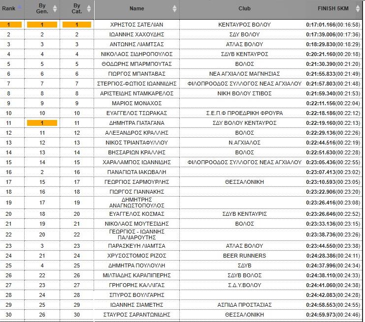 Και φυσικά, όλα τα μαγαζιά στο παραλιακό μέτωπο, και όχι μόνο, γέμισαν αφού μετά το τρέξιμο ή τη βόλτα, σειρά είχε ο καφές και τα τσιπουράκια… Παρακάτω στις δύο εικόνες τα αποτελέσματα των πρώτων 30 αθλητών στα 5 και 10 χιλιόμετρα: